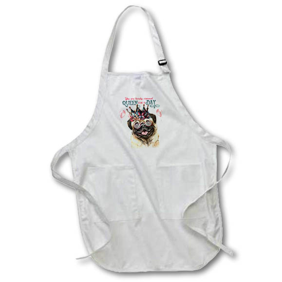 Funny Pug Dog for Dog Moms in a Queen for a Day Theme and Crown Apron is made of a 65/35 poly/cotton blend. Whether it is put to use in a restaurant or at home, this apron will always help to keep you clean. Full length features adjustable neck strap. Medium length features non-adjustable neck strap that fits over your head. Both sizes also tie around the waist.