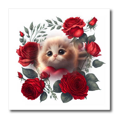 Red roses and beautiful cat a purrrfect gift Iron on Heat Transfer is a great way to jazz up a plain T-shirt, pillow case or any other light colored fabric. The transfer is transparent and should be applied only to white or light colored material suitable to withstand high heat. Available in 6", 8" and 10". Color not true until transferred; home iron instructions included. Wash inside out using mild detergent and dry on low heat. Made in USA.