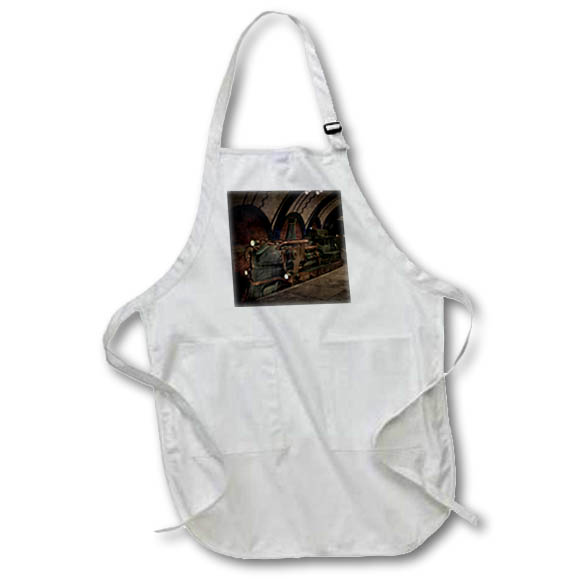 A steampunk train at a modern station Apron is made of a 65/35 poly/cotton blend. Whether it is put to use in a restaurant or at home, this apron will always help to keep you clean. Full length features adjustable neck strap. Medium length features non-adjustable neck strap that fits over your head. Both sizes also tie around the waist.
