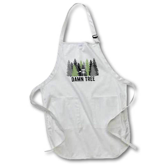 Apron - Damn Tree with disc golf basket in a row of pines on white background. Stamp City - typography - disc golf