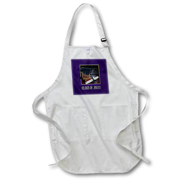 Apron - Image of Grad Cap, Books, Time Piece, Diploma Purple, Gold , 2023 Graduation Design