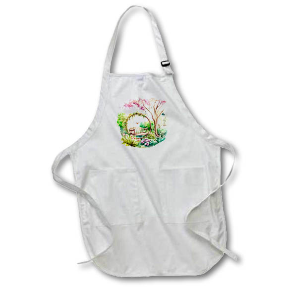 Image Of Watercolor Scene In A Park With A Bench Swing Apron is made of a 65/35 poly/cotton blend. Whether it is put to use in a restaurant or at home, this apron will always help to keep you clean. Full length features adjustable neck strap. Medium length features non-adjustable neck strap that fits over your head. Both sizes also tie around the waist.