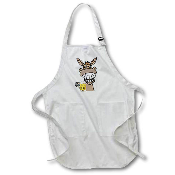 Funny Cute Donkey drinking Beer Mug Satire Apron is made of a 65/35 poly/cotton blend. Whether it is put to use in a restaurant or at home, this apron will always help to keep you clean. Full length features adjustable neck strap. Medium length features non-adjustable neck strap that fits over your head. Both sizes also tie around the waist.