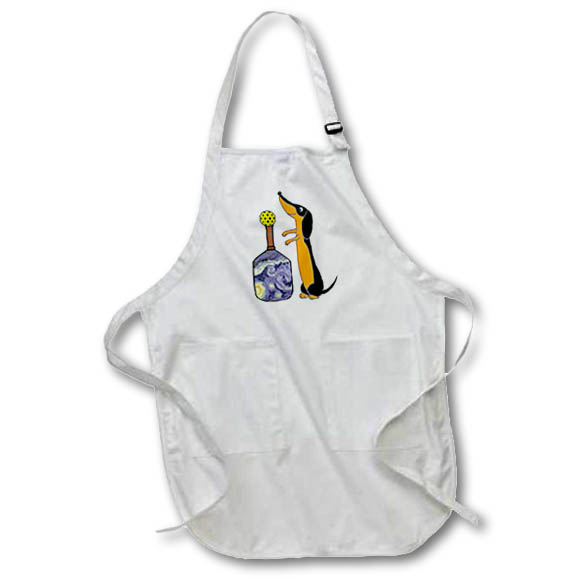 Funny Cute Dachshund Puppy Dog with Pickleball Paddle and Ball Apron is made of a 65/35 poly/cotton blend. Whether it is put to use in a restaurant or at home, this apron will always help to keep you clean. Full length features adjustable neck strap. Medium length features non-adjustable neck strap that fits over your head. Both sizes also tie around the waist.