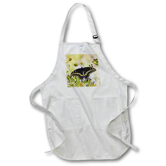 Black swallowtail butterfly feeding. Apron is made of a 65/35 poly/cotton blend. Whether it is put to use in a restaurant or at home, this apron will always help to keep you clean. Full length features adjustable neck strap. Medium length features non-adjustable neck strap that fits over your head. Both sizes also tie around the waist.