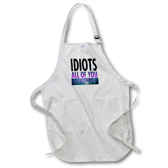 Image of Words Idiots All Of You Apron is made of a 65/35 poly/cotton blend. Whether it is put to use in a restaurant or at home, this apron will always help to keep you clean. Full length features adjustable neck strap. Medium length features non-adjustable neck strap that fits over your head. Both sizes also tie around the waist.