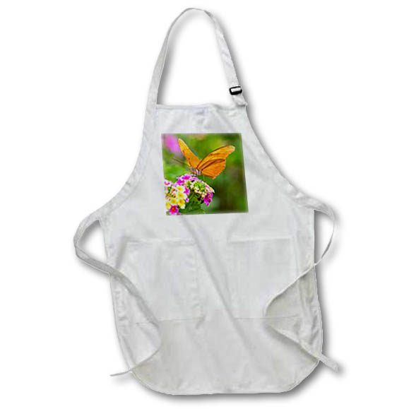 Julia Heliconian nectaring at lantana flowers Apron is made of a 65/35 poly/cotton blend. Whether it is put to use in a restaurant or at home, this apron will always help to keep you clean. Full length features adjustable neck strap. Medium length features non-adjustable neck strap that fits over your head. Both sizes also tie around the waist.