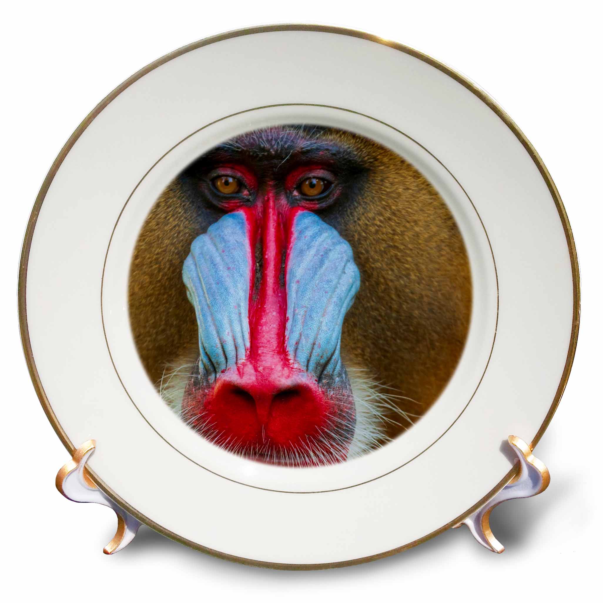 closeup of the face of a mandrill. Mandrillus sphinx. Captive. Plate is 7.5" in diameter. Made of white porcelain featuring two 24k gold rims. Excellent to give as a gift commemorating a special person or event. Stand included. Decorative use only.