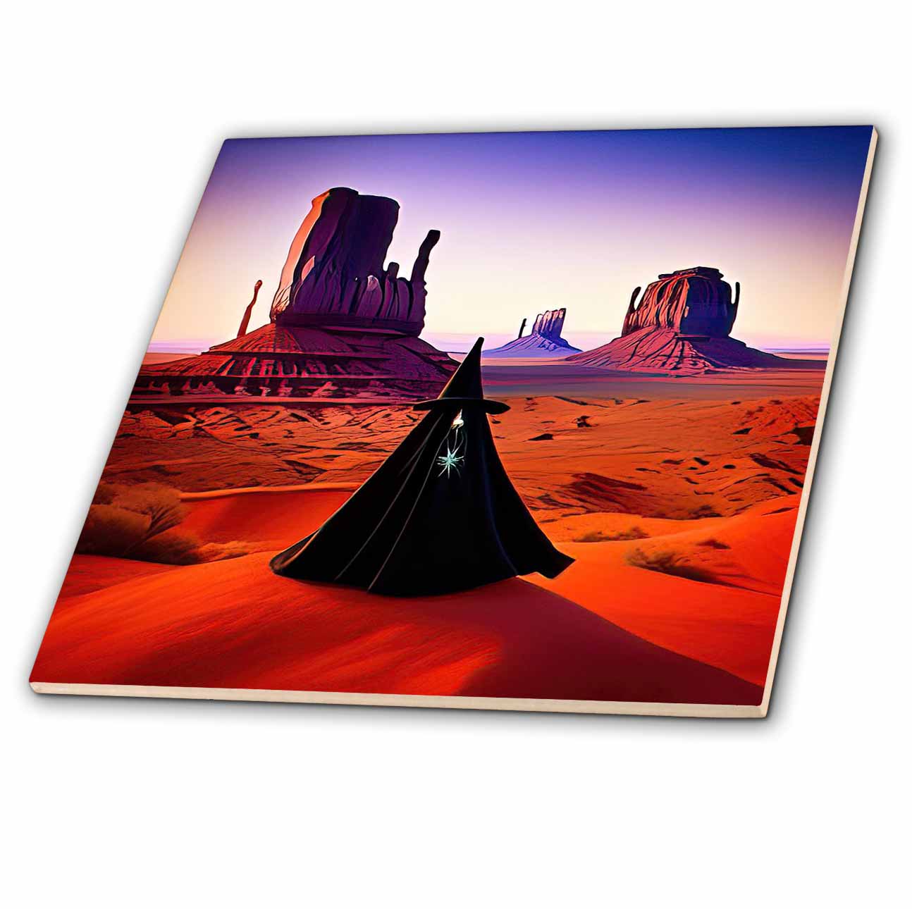 Witch in a cloak and tall hat in Monument Valley. Halloween gift Tile is great for a backsplash, countertop or as an accent. This commercial quality construction grade tile has a high gloss finish. The image is applied to the top surface and can be cleaned with a mild detergent.