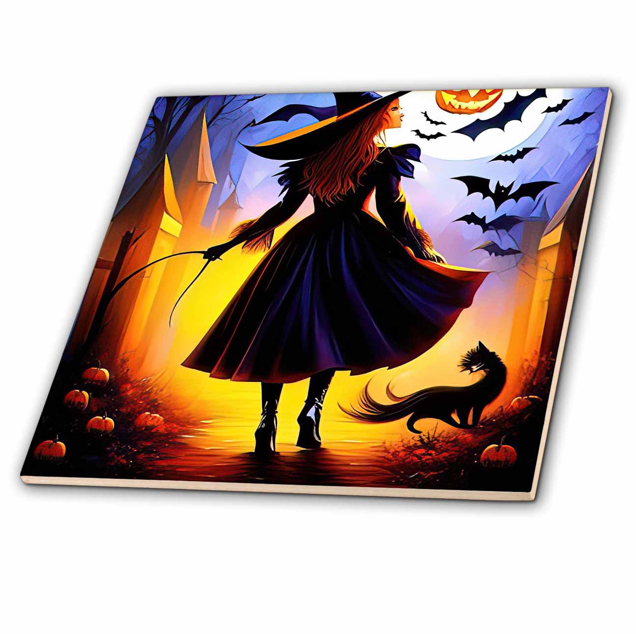 Tile - Witch Lady with Black Cat and Bats in Fantasy City - 3dRose