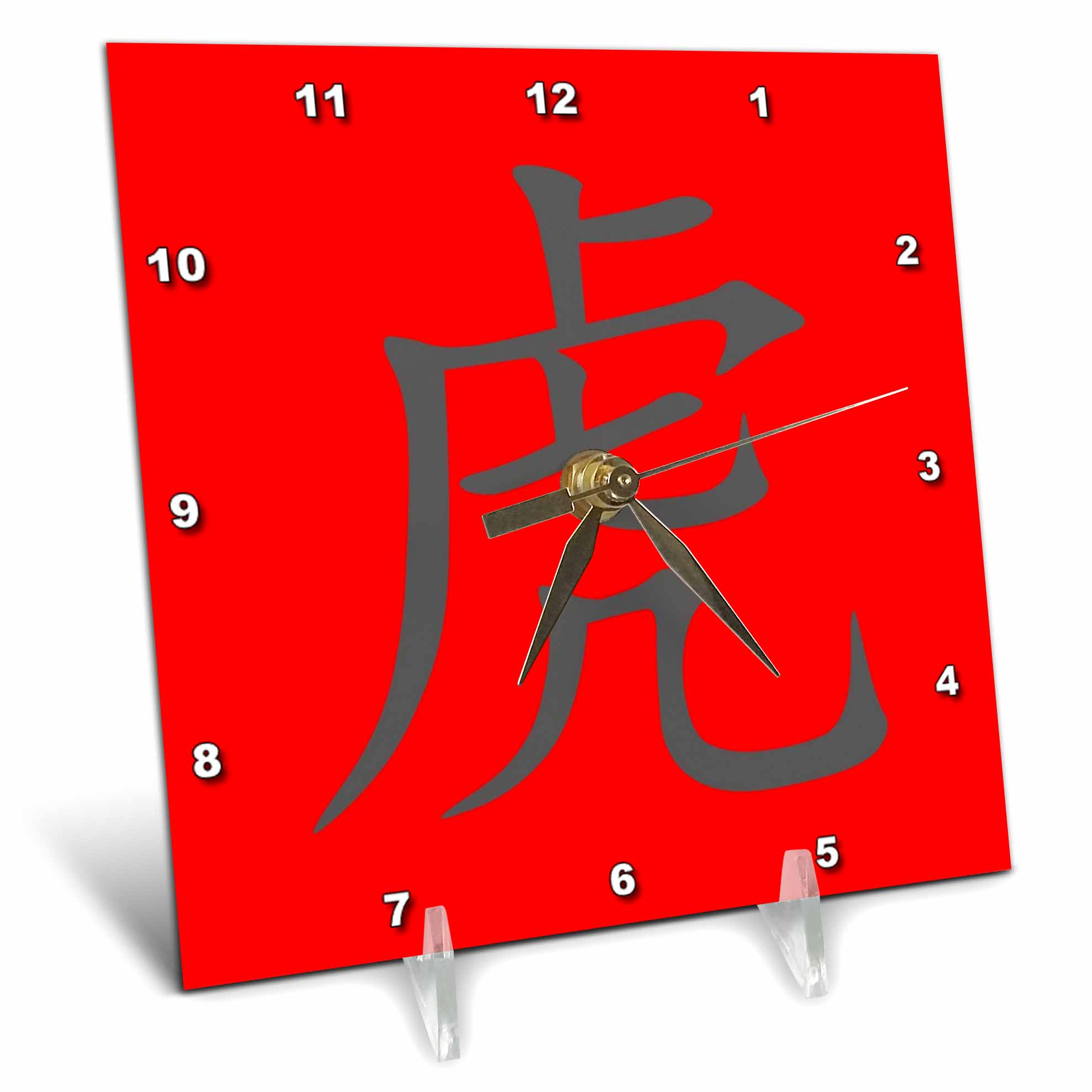Chinese Characters Year Of The Tiger Grey Calligraphy Desk Clock is a wonderful complement to any room in your home or office. Made of durable high grade aluminum. This frame-less clock has a high gloss mirror like, UV coated, scratch resistant finish and is suitable for a moist environment. Measures 6" x 6" and requires one AA battery; not included. Battery box is not covered. Made in USA.