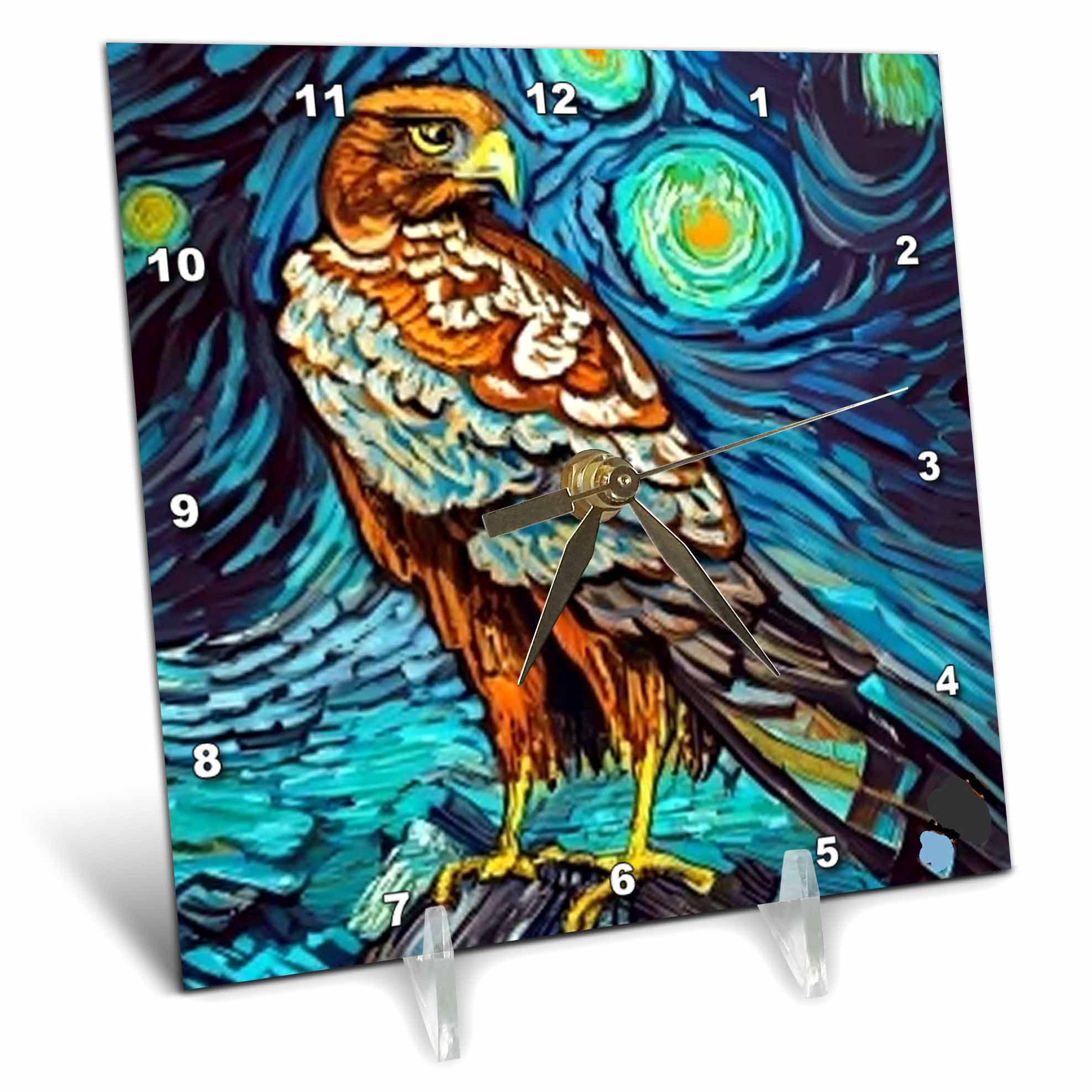 Cool Colorful Golden Eagle Bird in Van Gogh Starry Night Style Desk Clock is a wonderful complement to any room in your home or office. Made of durable high grade aluminum. This frame-less clock has a high gloss mirror like, UV coated, scratch resistant finish and is suitable for a moist environment. Measures 6" x 6" and requires one AA battery; not included. Battery box is not covered. Made in USA.
