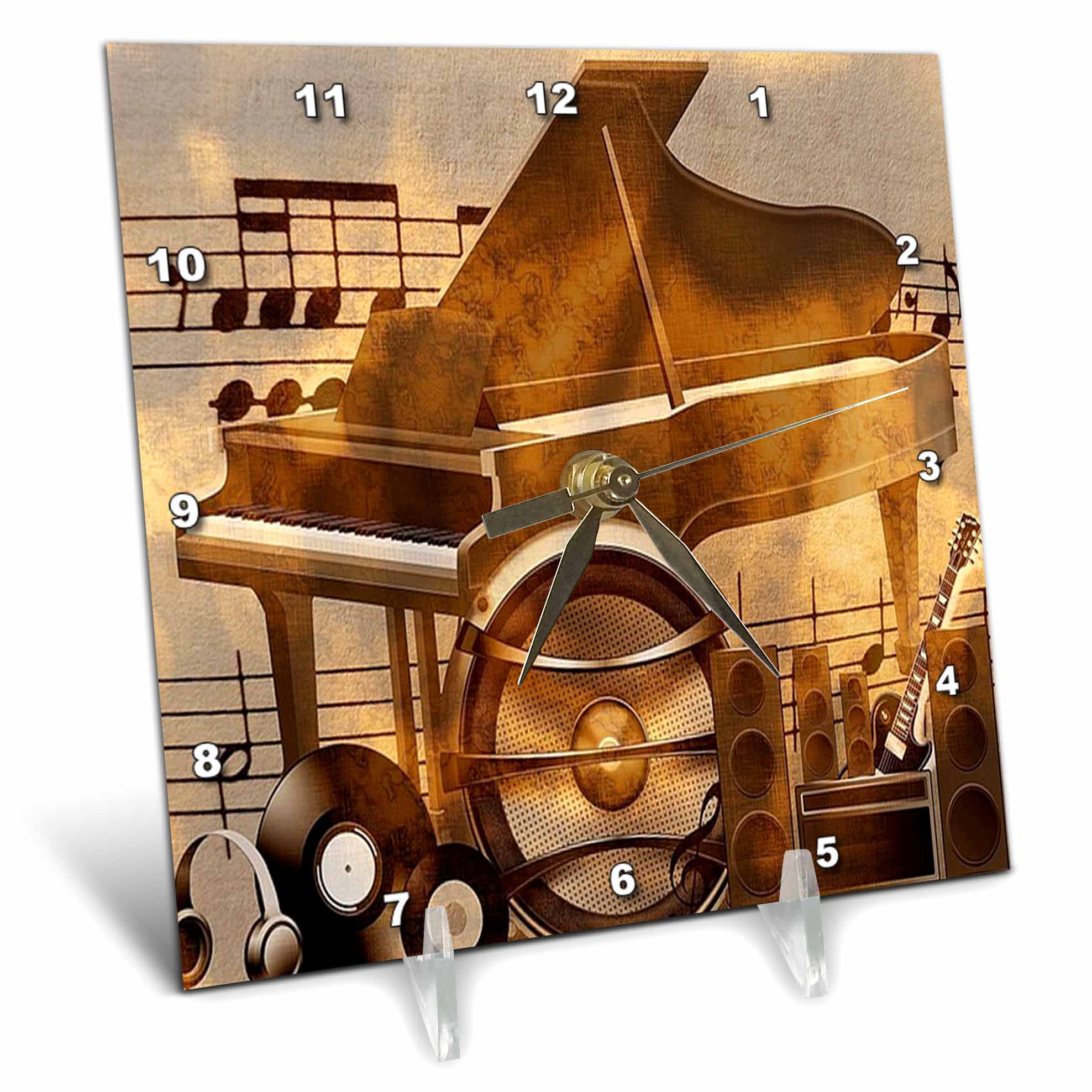 3dRose Florene - Music II - Print of Retro Speakers Piano Guitar and Records - Desk Clocks (dc_204241)