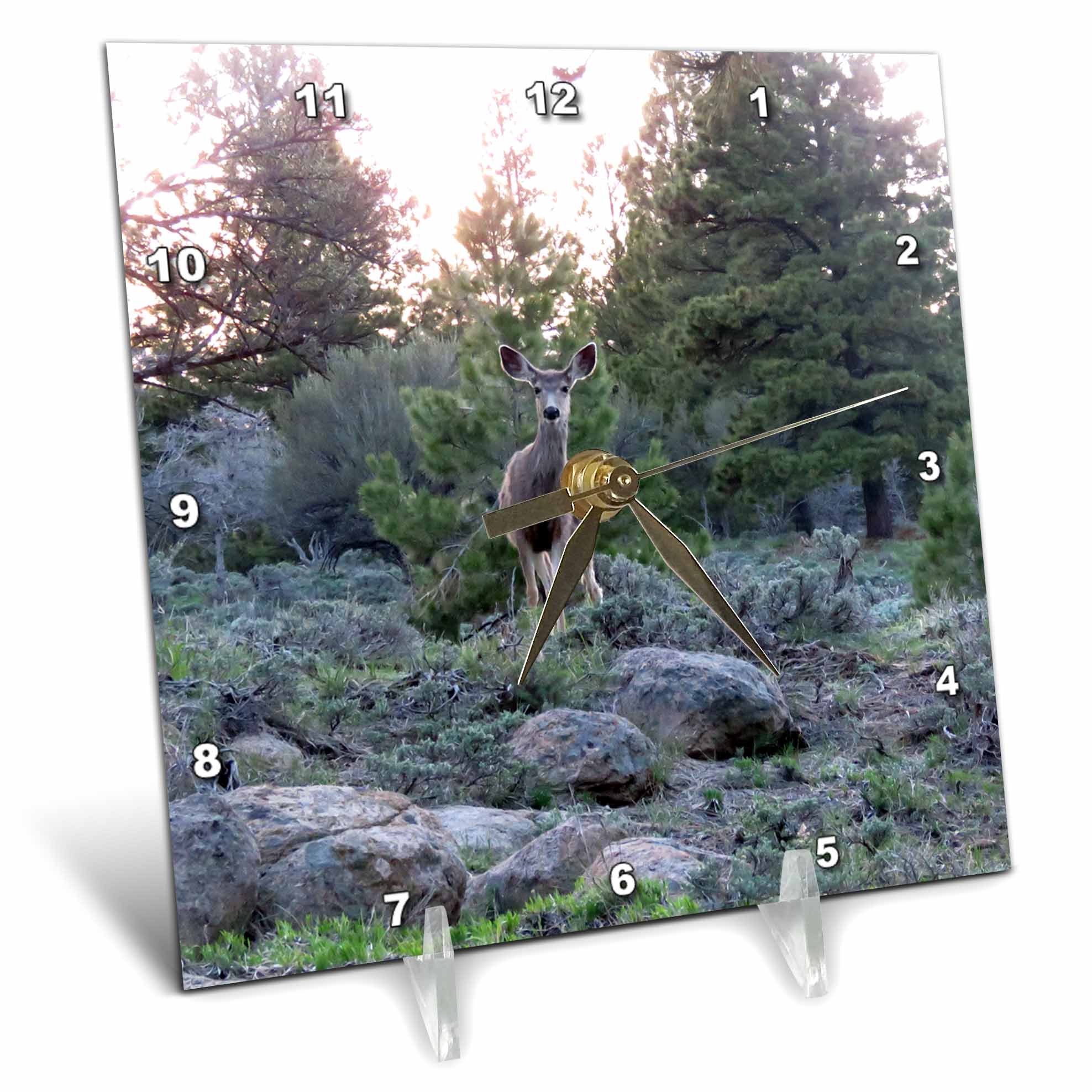 3dRose Jos Fauxtographee- Deer - A Single Deer Looking on Standing on Rocks and in Brush with Trees - Desk Clocks (dc_320069)