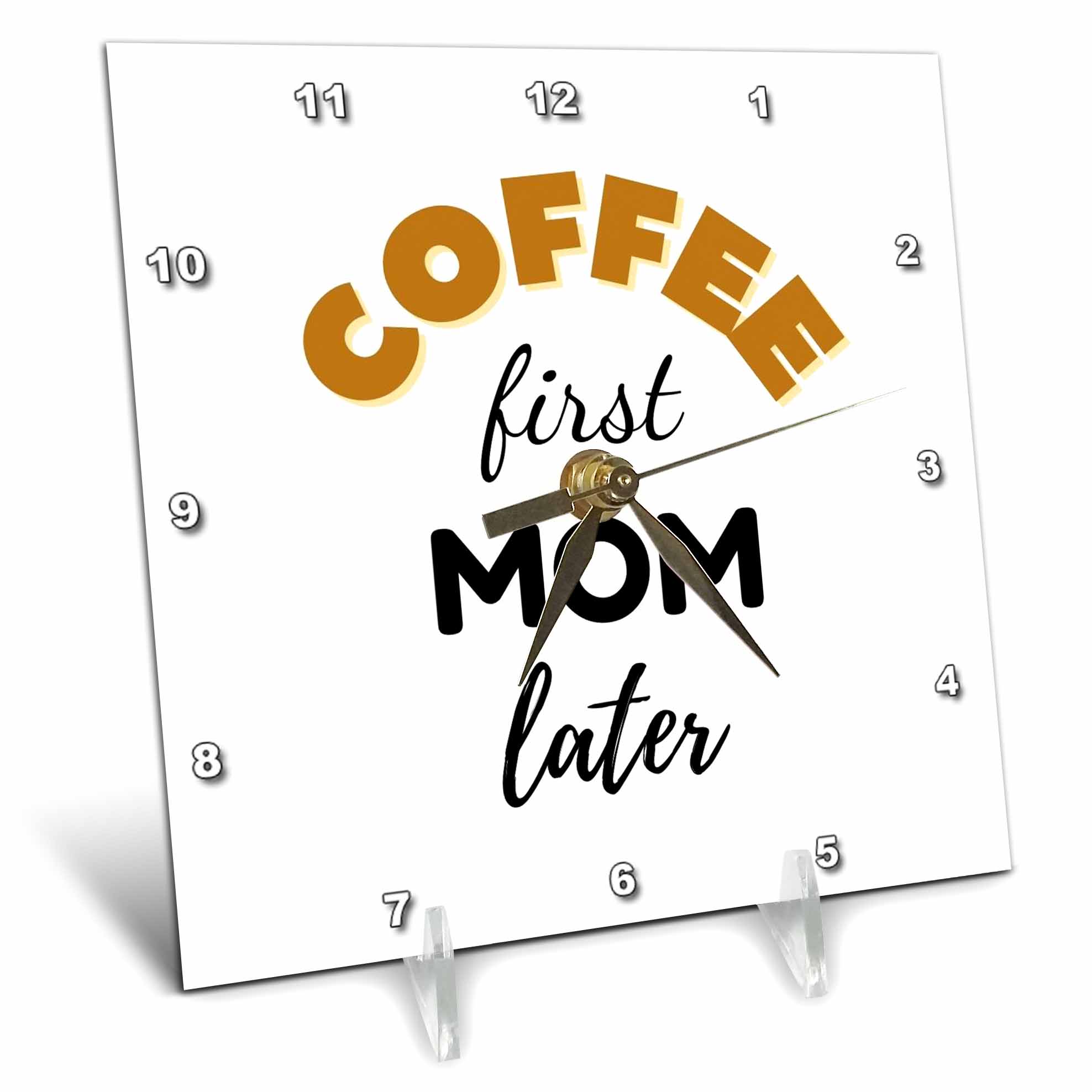 Text of Coffee first Mom Later Desk Clock is a wonderful complement to any room in your home or office. Made of durable high grade aluminum. This frame-less clock has a high gloss mirror like, UV coated, scratch resistant finish and is suitable for a moist environment. Measures 6" x 6" and requires one AA battery; not included. Battery box is not covered. Made in USA.