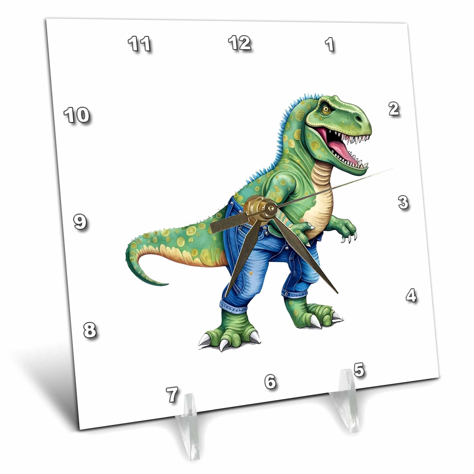 Dinosaur Wearing Denim Jeans Desk Clock is a wonderful complement to any room in your home or office. Made of durable high grade aluminum. This frame-less clock has a high gloss mirror like, UV coated, scratch resistant finish and is suitable for a moist environment. Measures 6" x 6" and requires one AA battery; not included. Battery box is not covered. Made in USA.