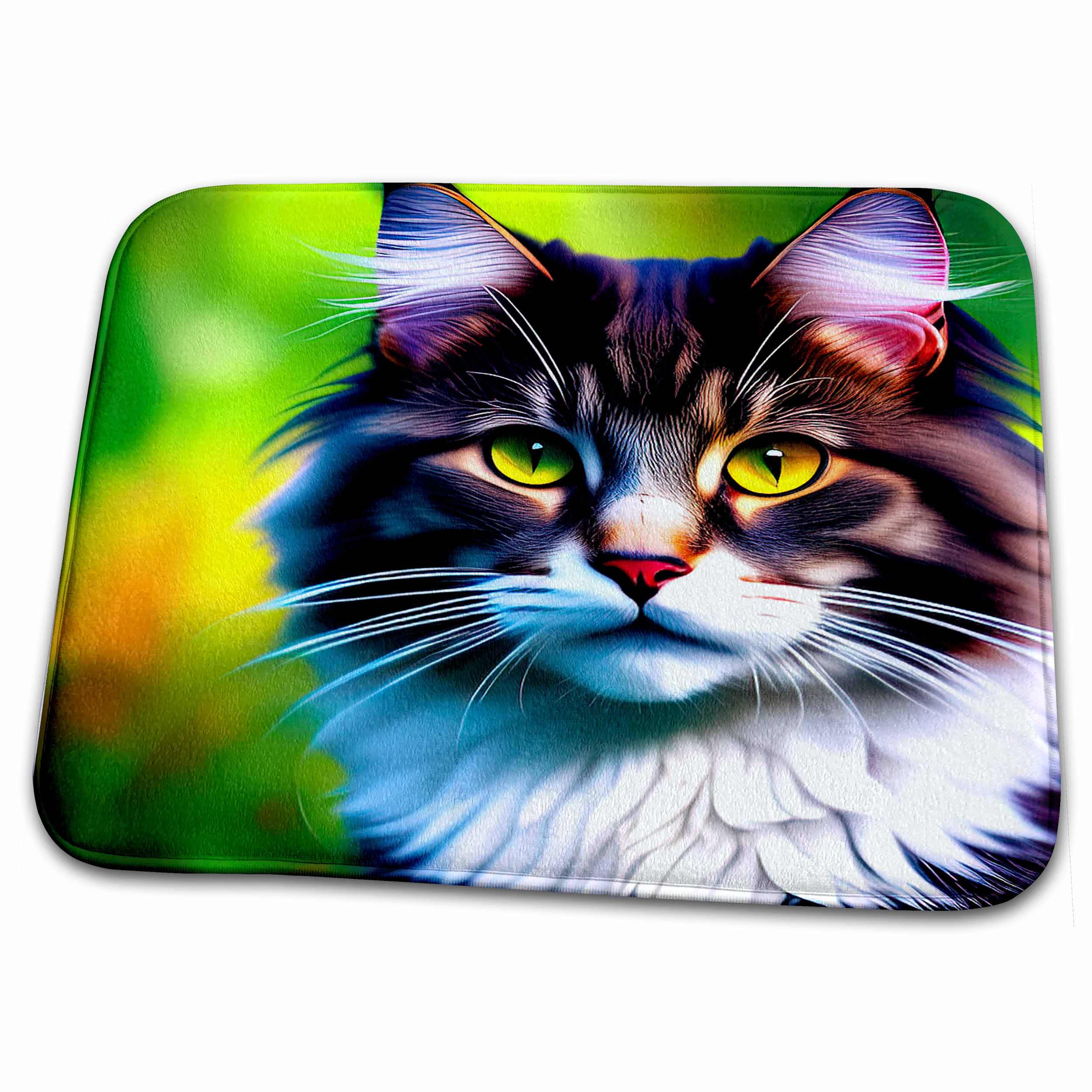 Charming Norwegian Forest cat face on green. Awesome digital art gift Dish Drying Mat is a high quality dish drying mat, 23" x 18" with 0.125" thickness. Printed with exquisite sublimated designs. Versatile for all types of countertops. Optimized for comfort and durability. Made of soft polyester.