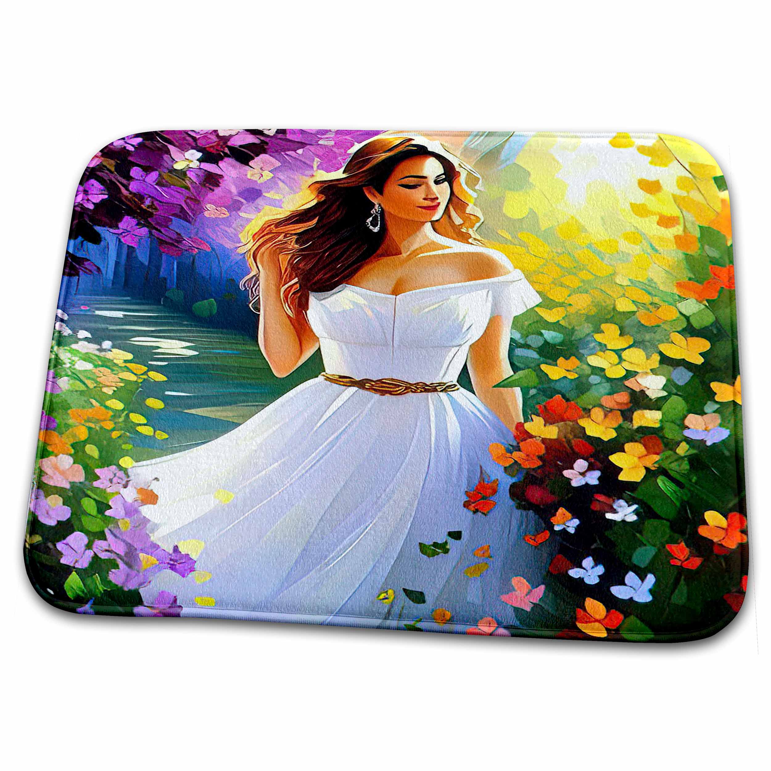 Classy young woman enjoys colorful flowers in the morning garden gift Dish Drying Mat is a high quality dish drying mat, 23" x 18" with 0.125" thickness. Printed with exquisite sublimated designs. Versatile for all types of countertops. Optimized for comfort and durability. Made of soft polyester.
