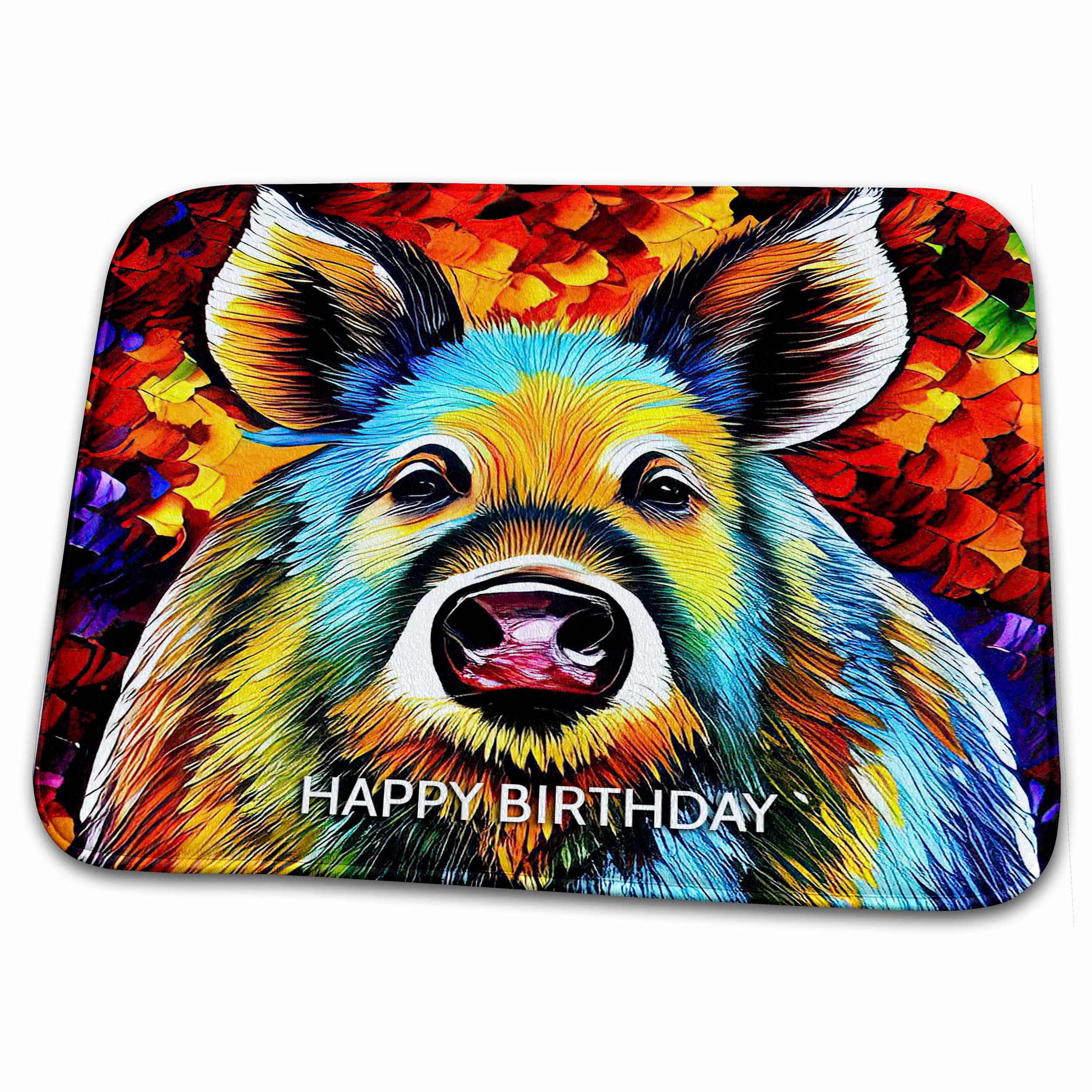 Happy Birthday. Colorful digital painting of wild boar. Funny card Dish Drying Mat is a high quality dish drying mat, 23" x 18" with 0.125" thickness. Printed with exquisite sublimated designs. Versatile for all types of countertops. Optimized for comfort and durability. Made of soft polyester.