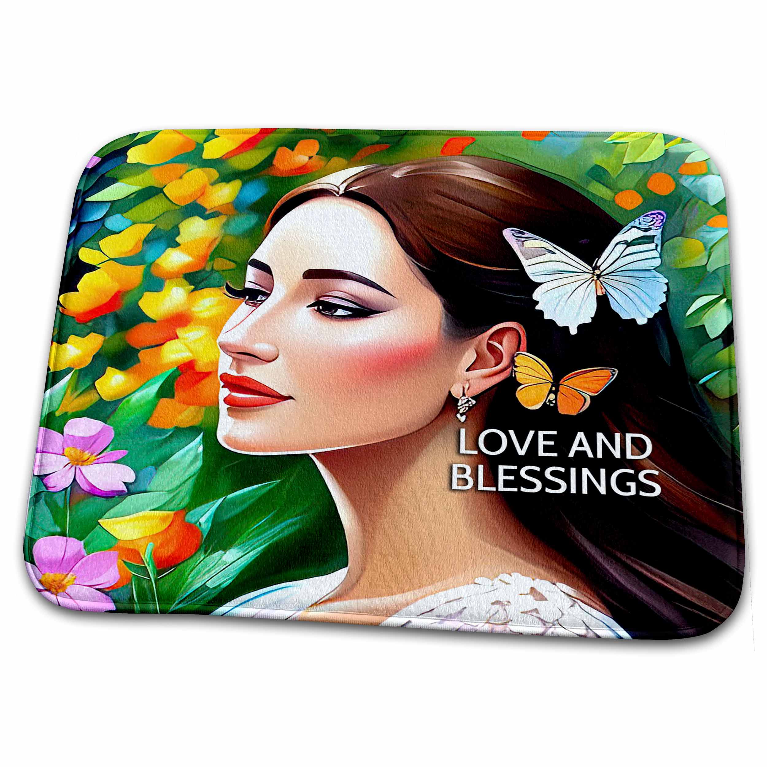 Love And Blessings. Adorable young woman and two butterflies card Dish Drying Mat is a high quality dish drying mat, 23" x 18" with 0.125" thickness. Printed with exquisite sublimated designs. Versatile for all types of countertops. Optimized for comfort and durability. Made of soft polyester.