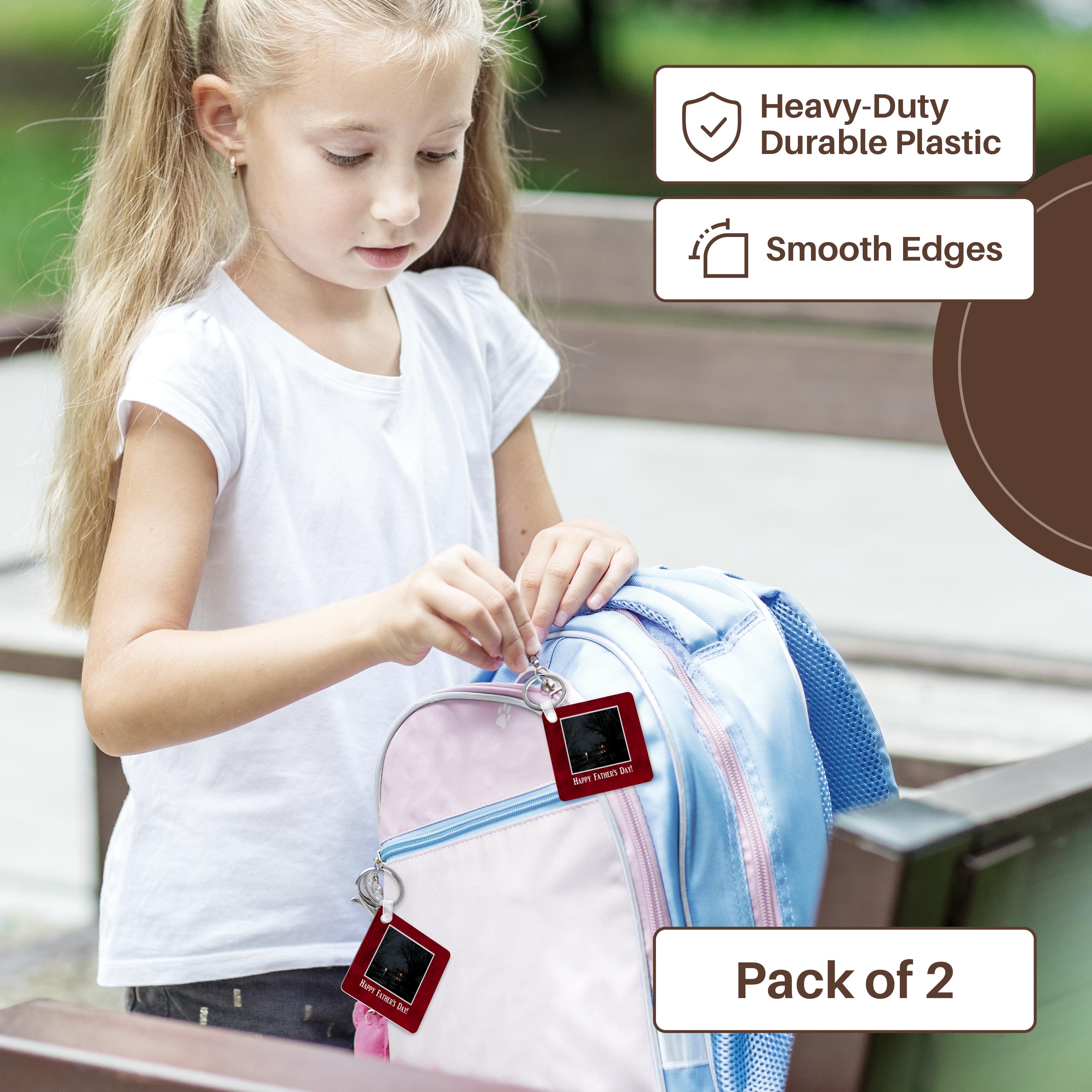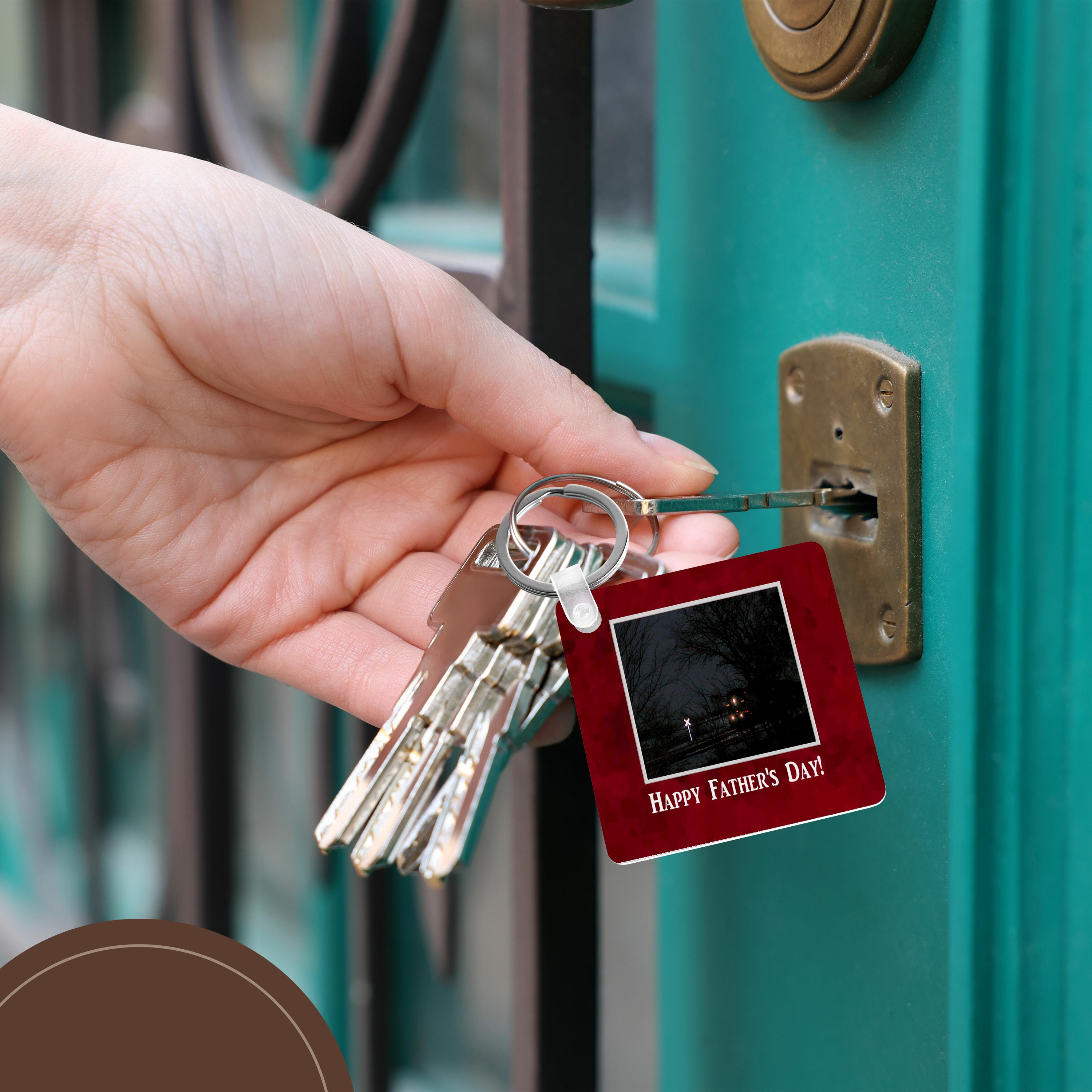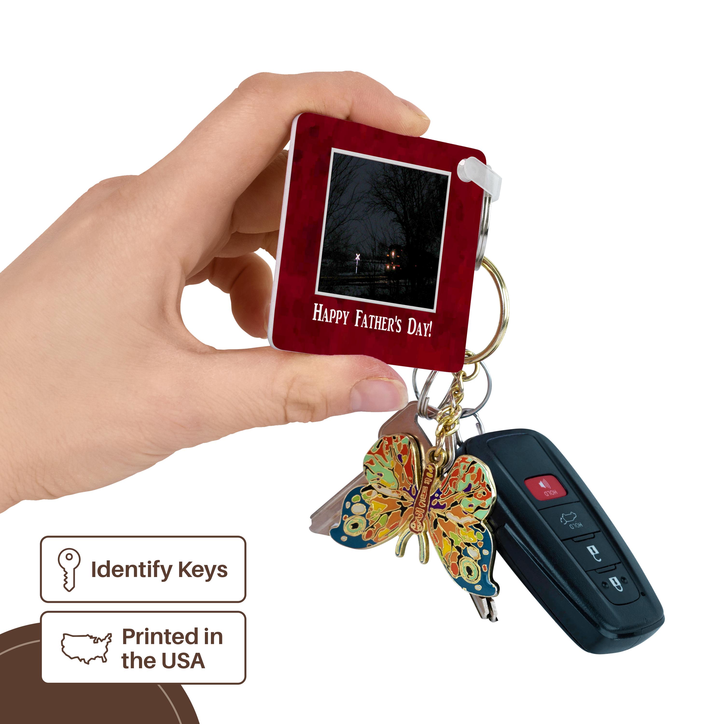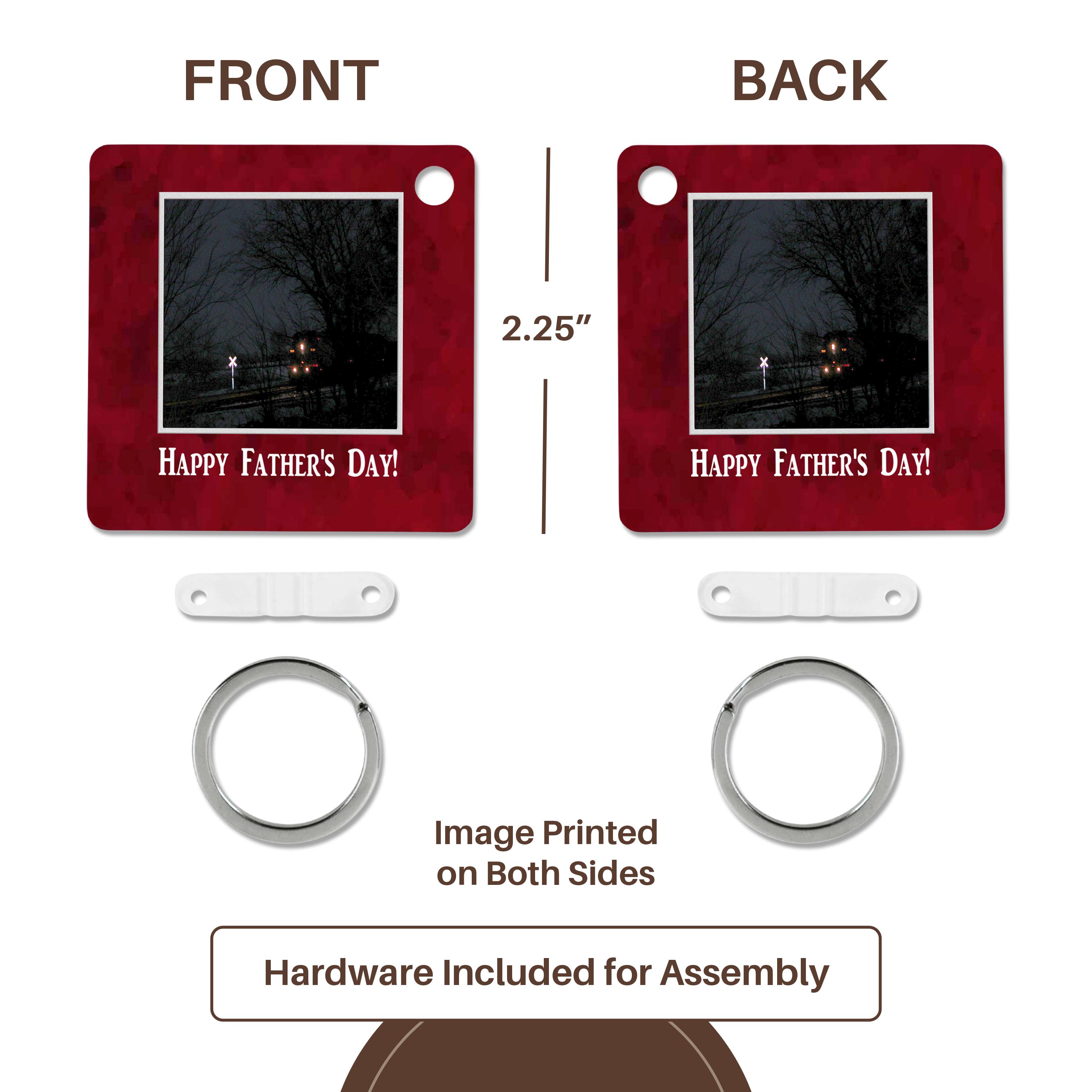 Night Train in Red Frame, Happy Fathers Day Key Chain is available in sets of 2, 4 and 6; making them perfect for sharing. Image is printed on both sides and has a high gloss finish. Measures 2 3/8" x 2 3/8" x 3/8" and are made of heavy duty durable plastic. Rings and plastic clips included.