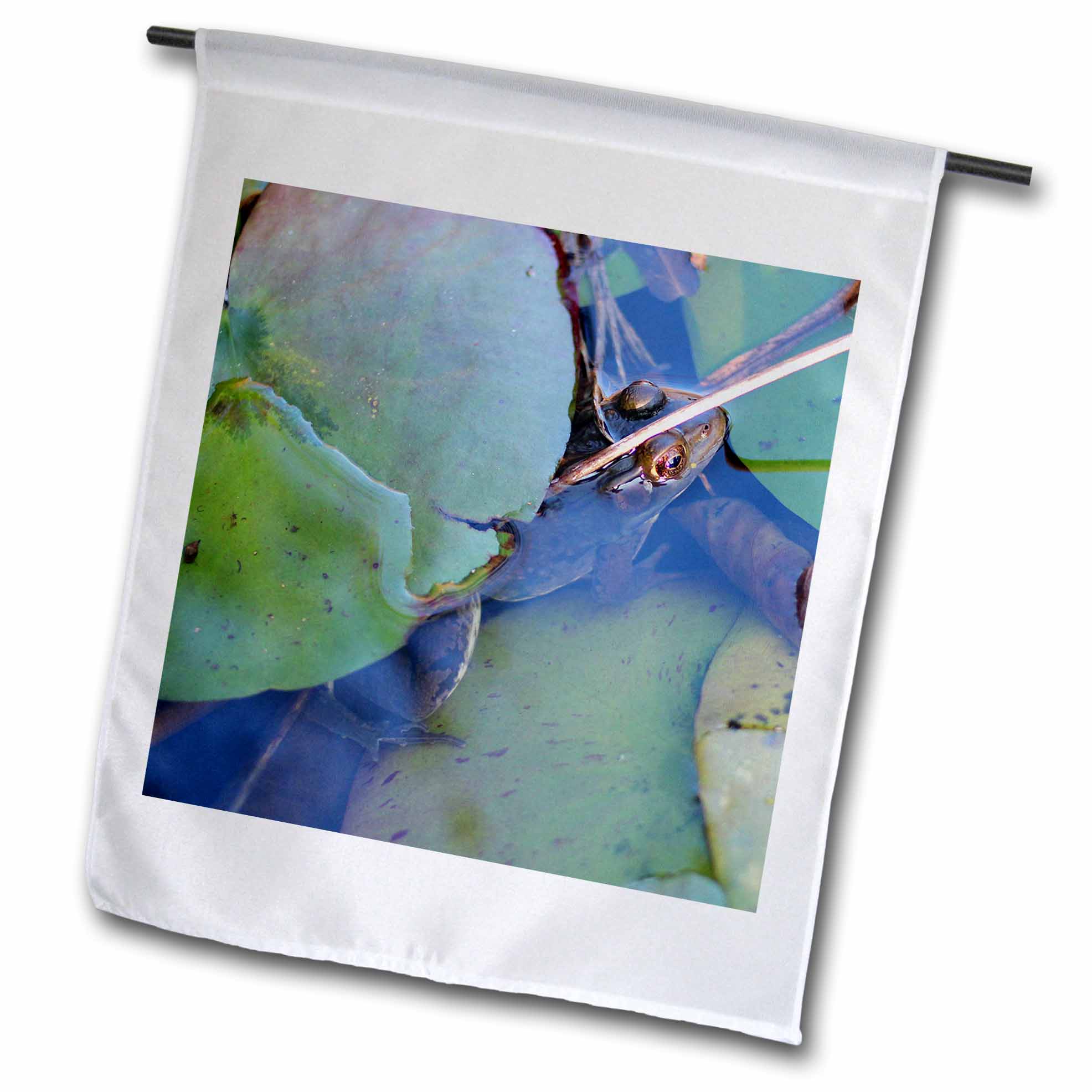 3dRose Stamp City - animals - Photograph of frog hiding under lily pad in a pond. - Flags