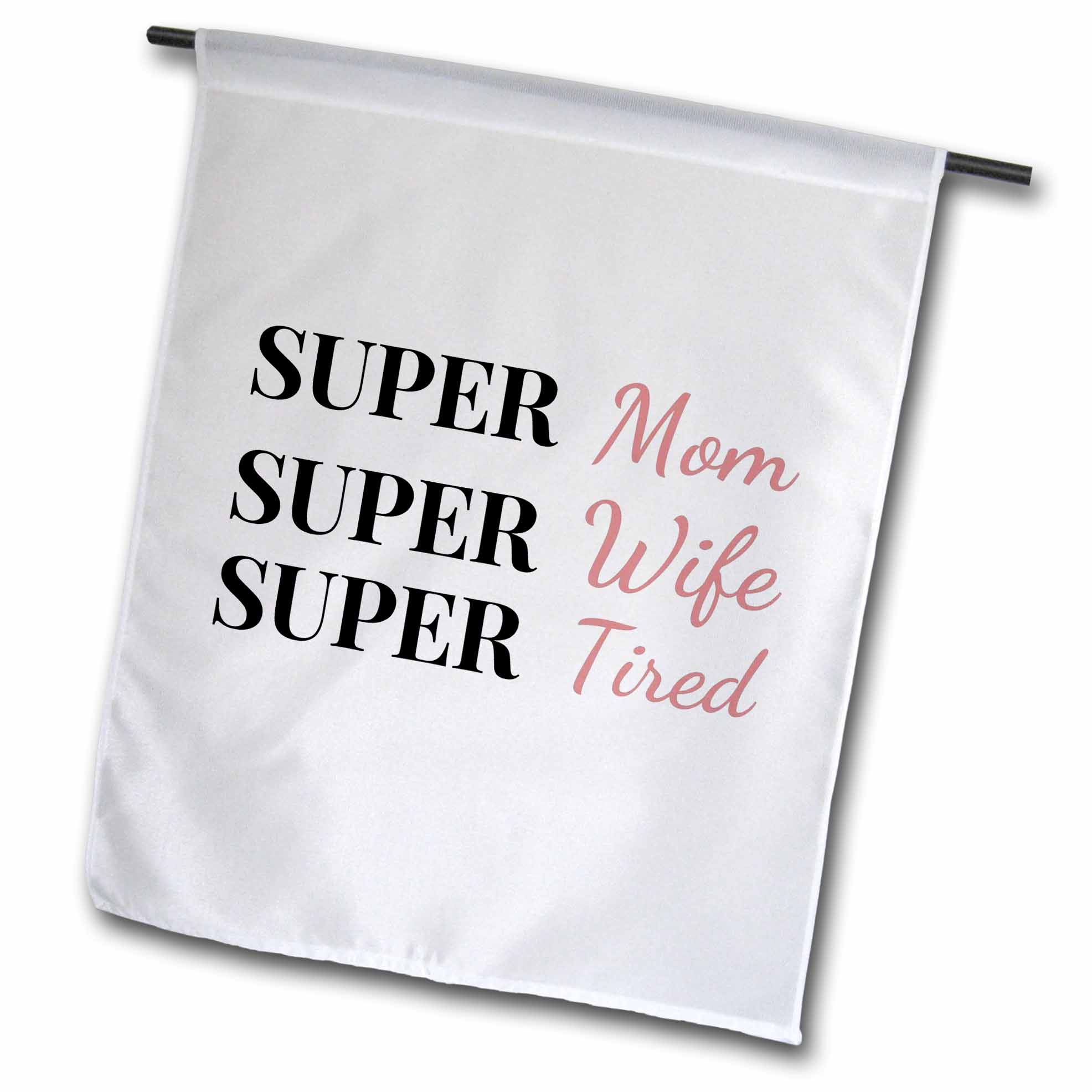 Text of Super Mom,Super Wife,Super Tired Flag is a creative way to celebrate all year round by adding a little bit of color and fun. Made of 100% single-ply semi-opaque polyester with the image printed on one side; a lighter image will be visible on the backside. Hang using a pole, on the wall, ceiling, banister, and door or anywhere you feel the need to add a splash of color. Hanging hardware/pole not included.