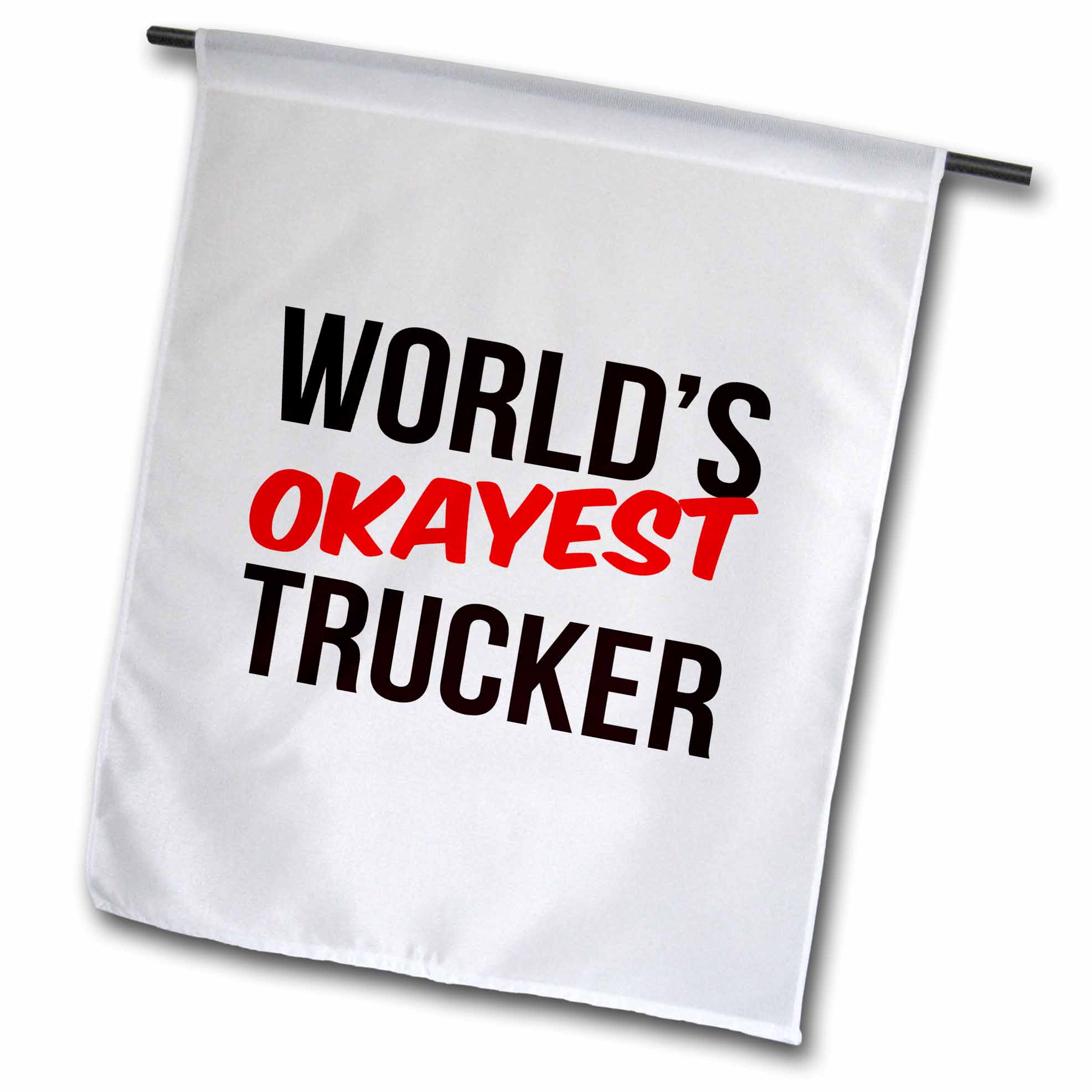 Worlds Okayest Trucker Flag is a creative way to celebrate all year round by adding a little bit of color and fun. Made of 100% single-ply semi-opaque polyester with the image printed on one side; a lighter image will be visible on the backside. Hang using a pole, on the wall, ceiling, banister, and door or anywhere you feel the need to add a splash of color. Hanging hardware/pole not included.