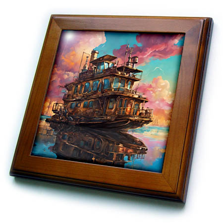3dRose Cassie Peters Digital Art - Steampunk Fantasy Houseboat - Framed Tiles (ft-385419)