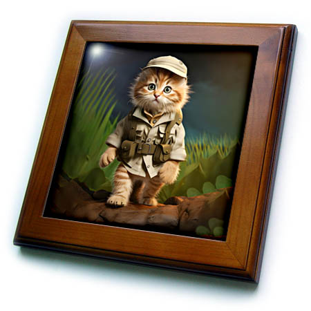 3dRose CR Media - Illustrations - Kitten Dressed as a Safari Explorer - Framed Tiles (ft-385466)