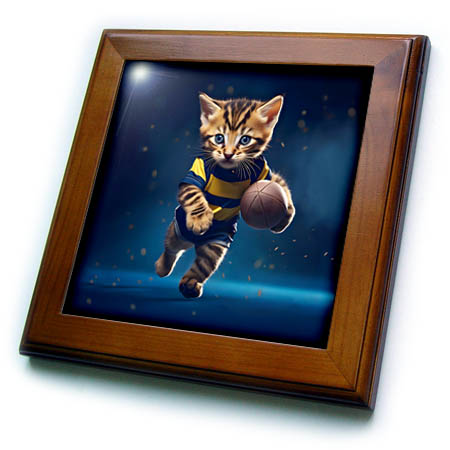 3dRose CR Media - Illustrations - Rugby Kitten Running with The Ball - Framed Tiles (ft-385457)