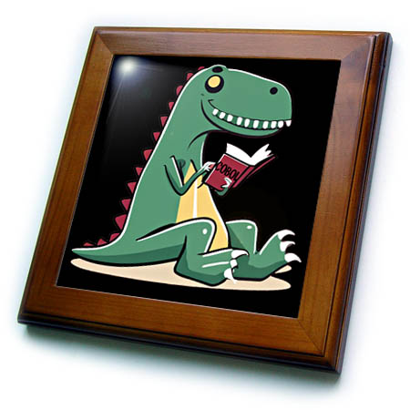 Cute Funny T-rex Dinosaur Reading Book called Cobol Programming Framed Tile is 8" x 8" with a 6" x 6" high gloss inset ceramic tile, surrounded by a solid wood frame with pre-drilled keyhole for easy wall mounting.