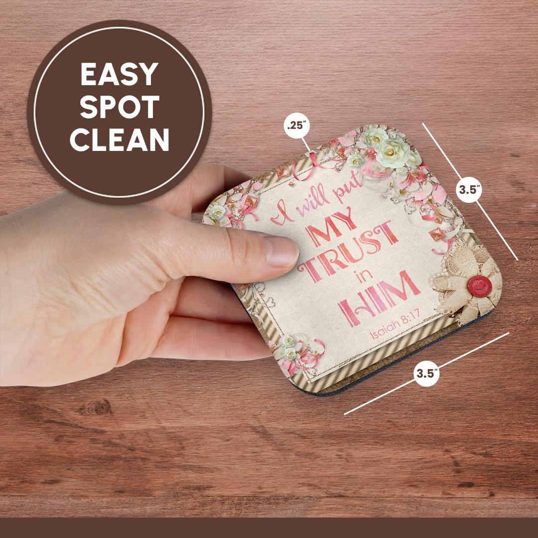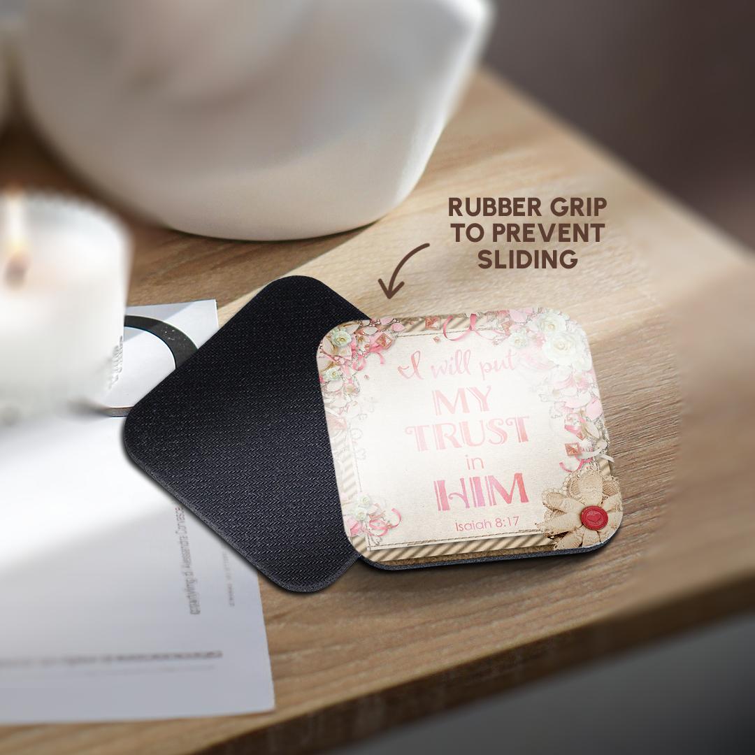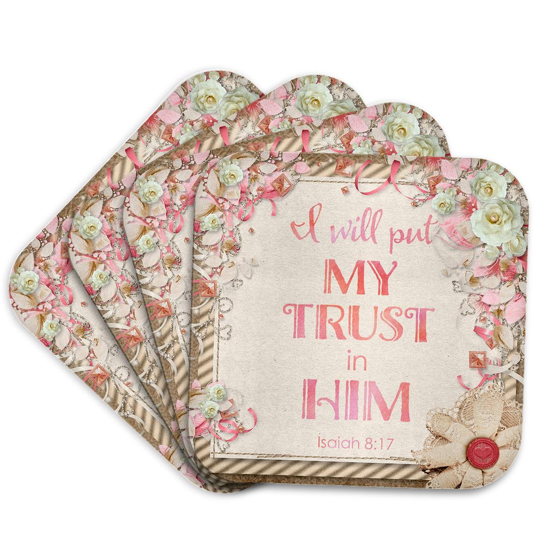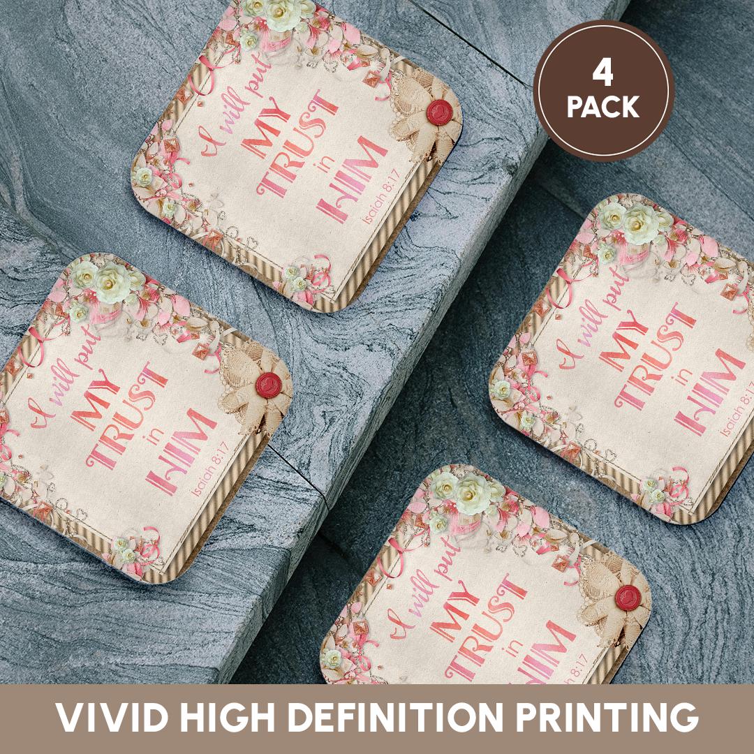 Nostalgic Illustration With Bible Psalm I Will Put My Trust In Him Coaster is a great complement to any home décor. Soft coasters are 3.5" x 3.5", are absorbent, and can be washed. Ceramic coasters are 4.25" x 4.25", non absorbent and come with felt corner pads. Available in sets of 4 and 8.