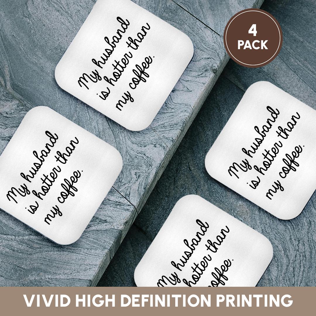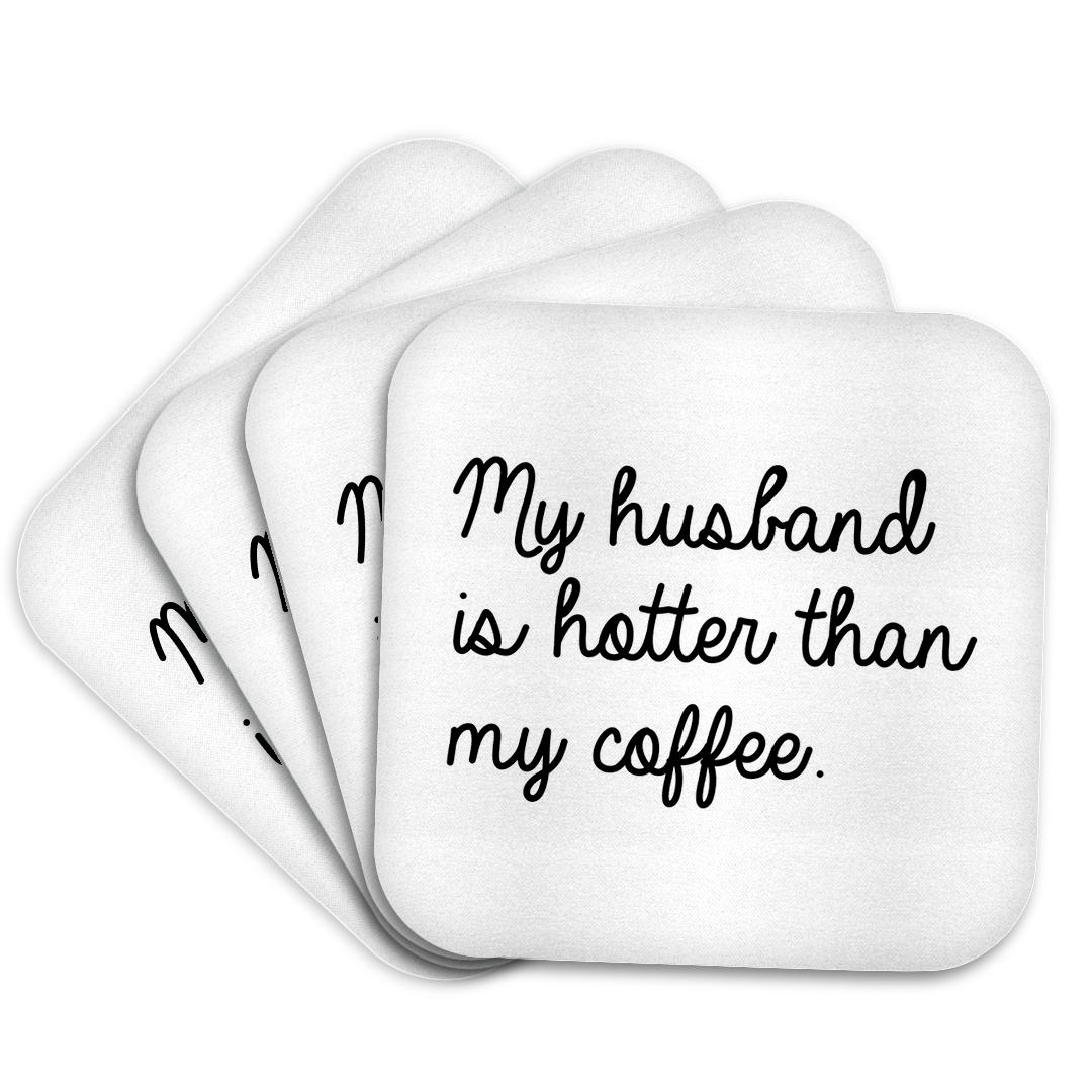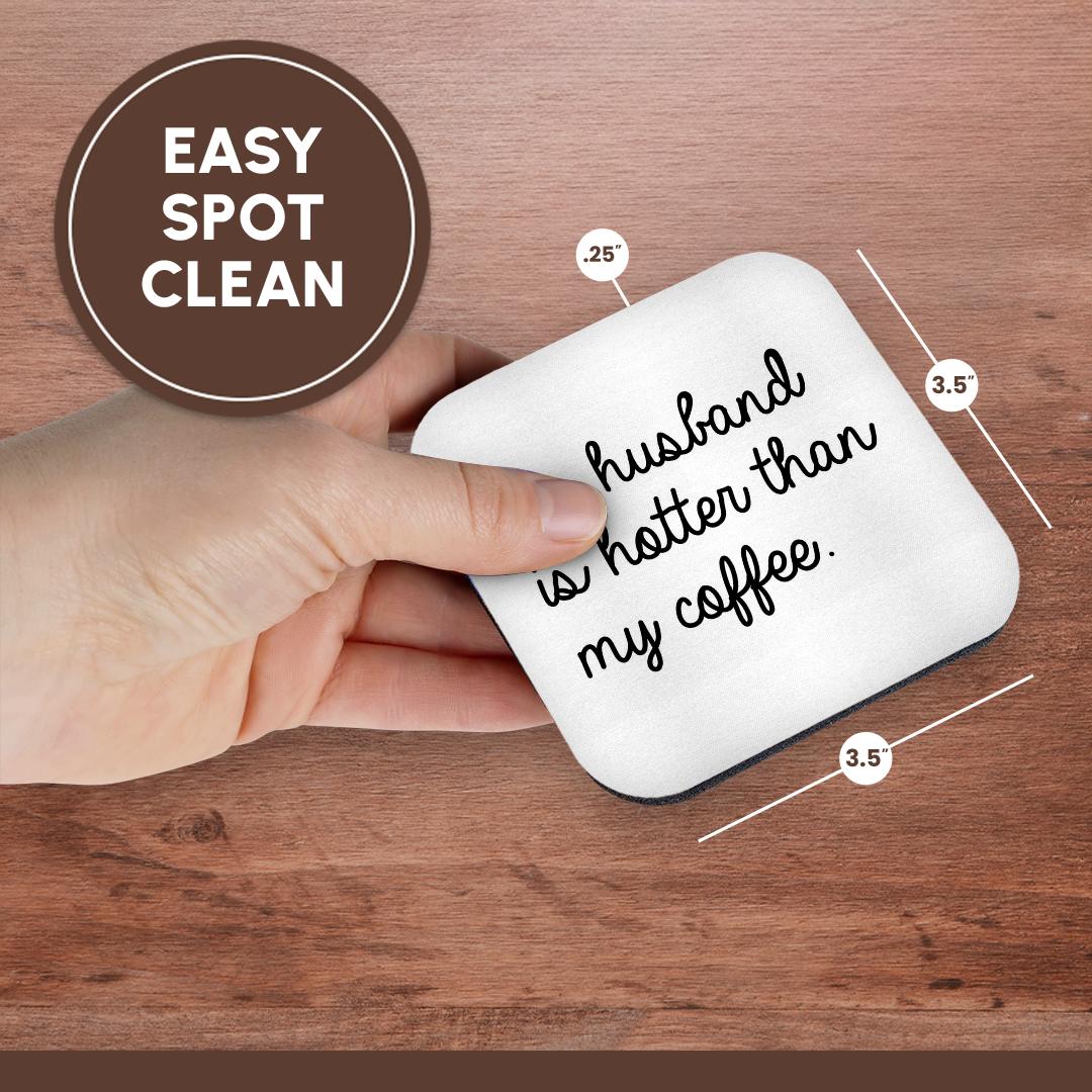 My Husband Is Hotter Than My Coffee Coaster is a great complement to any home décor. Soft coasters are 3.5" x 3.5", are absorbent, and can be washed. Ceramic coasters are 4.25" x 4.25", non absorbent and come with felt corner pads. Available in sets of 4 and 8.
