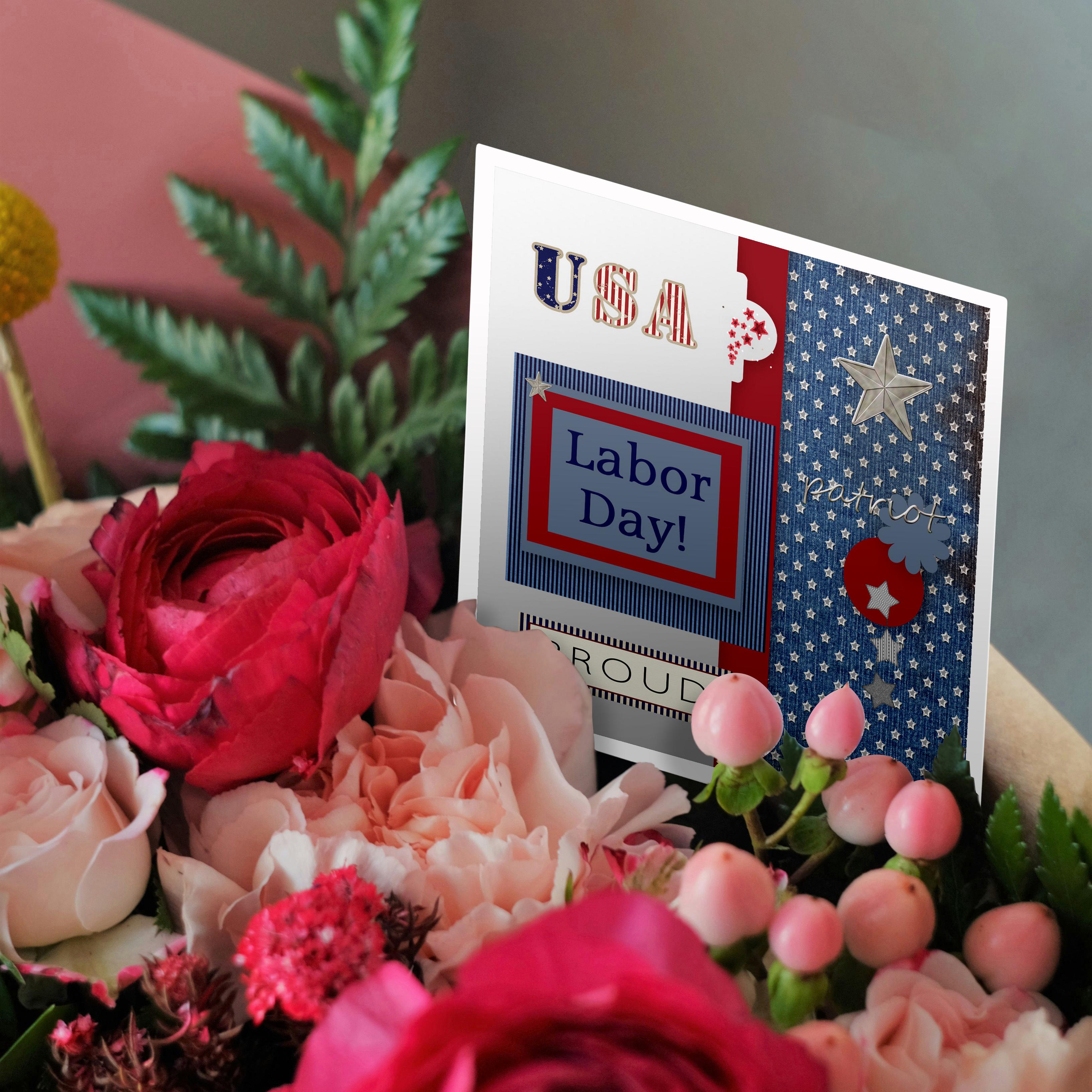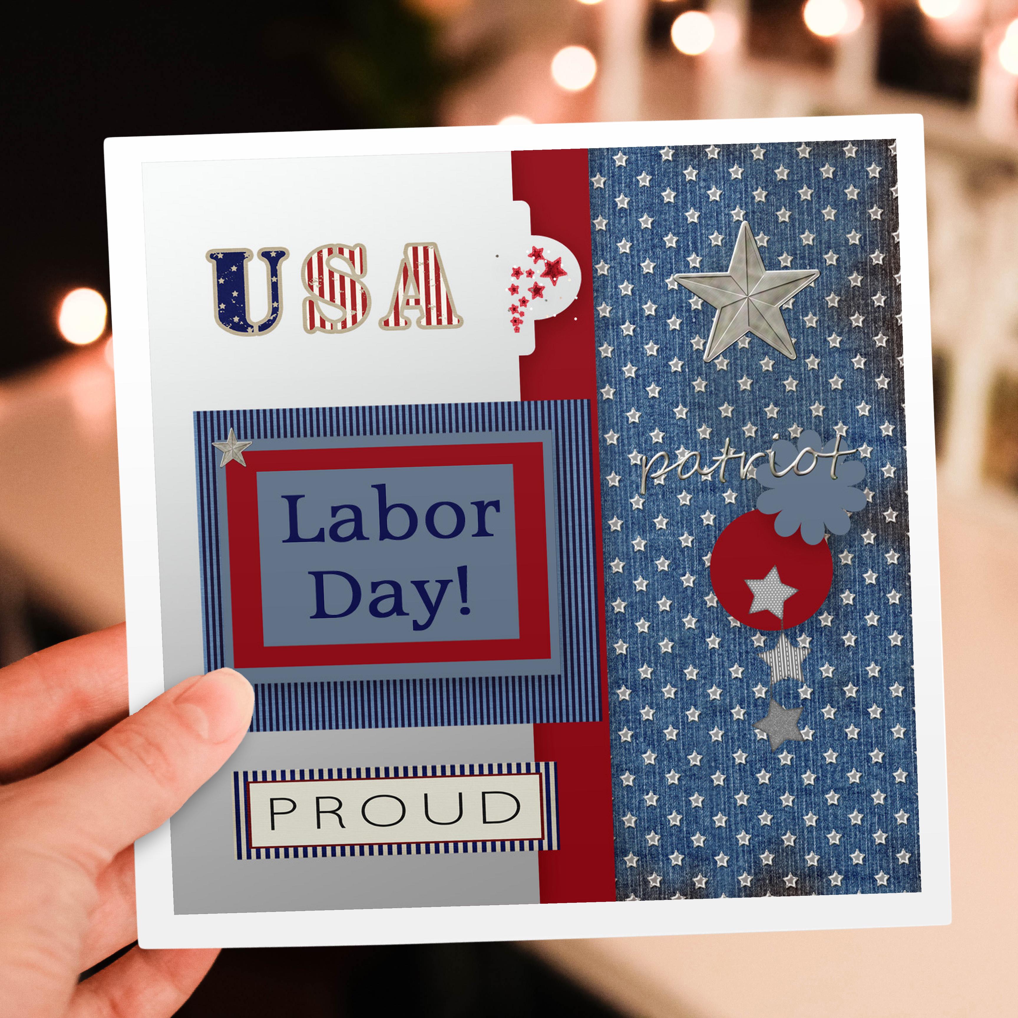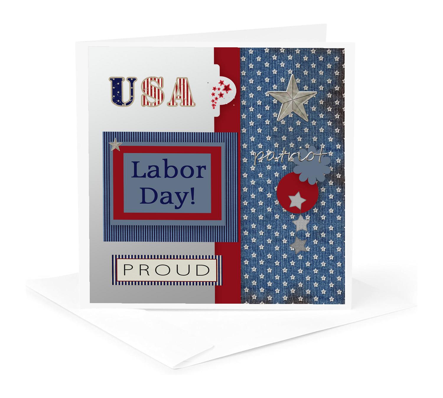 3dRose Beverly Turner Labor Day Design - Patriotic Stars and Words in Blue, Silver, White and Red, Labor Day - Greeting Cards (gc_130962)