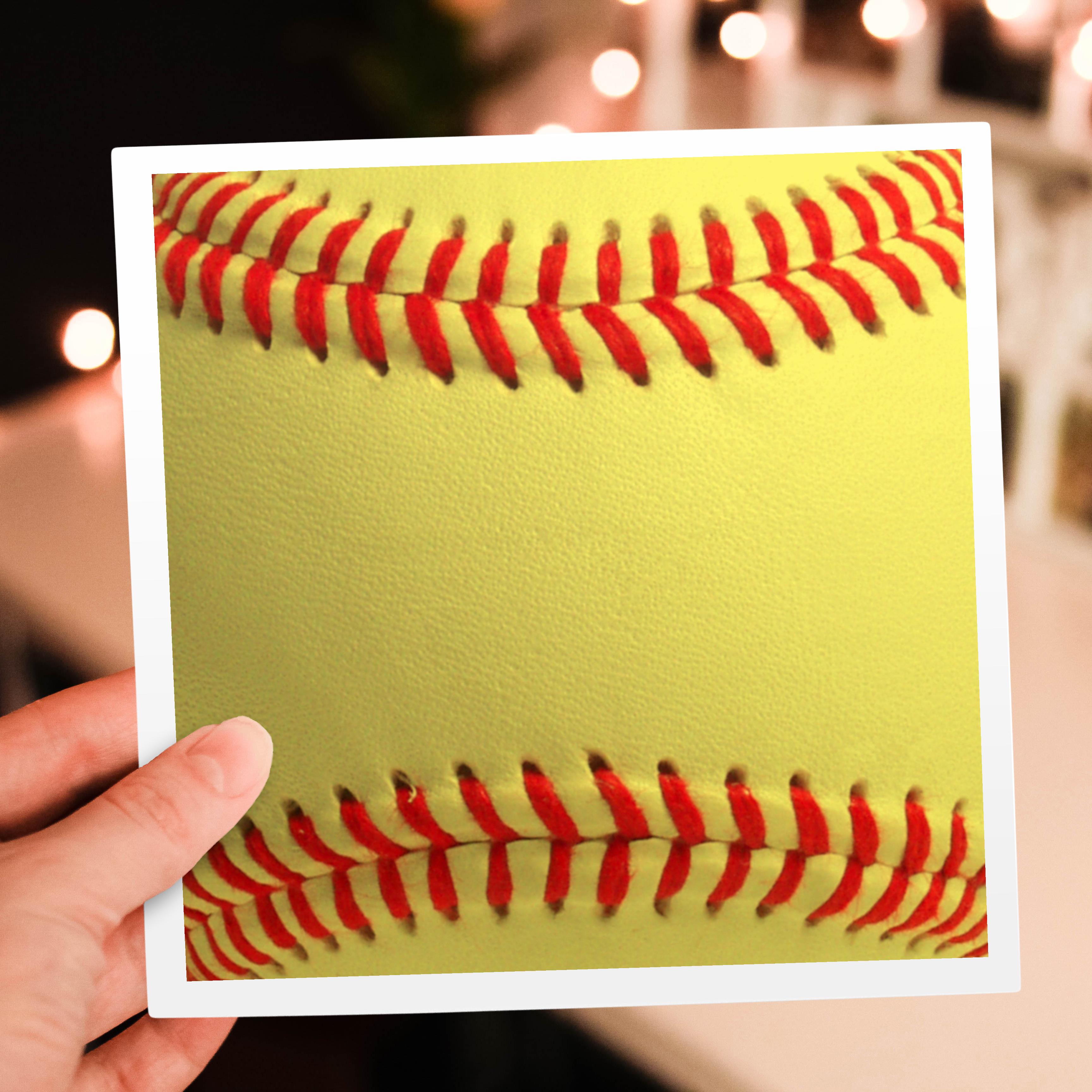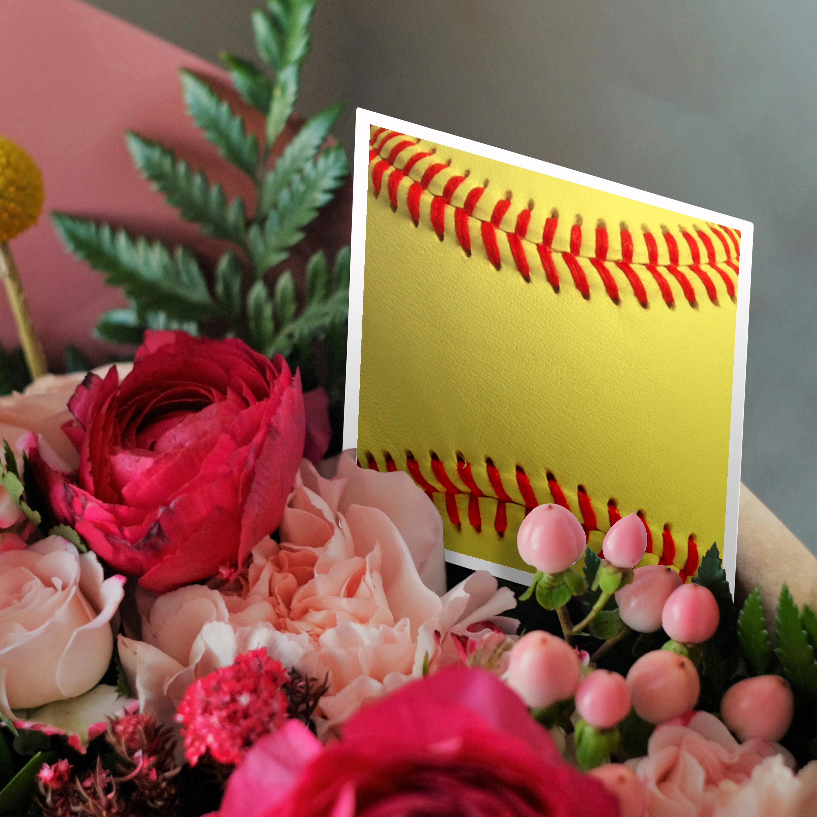 3dRose InspirationzStore Sports - Softball close-up photography print - yellow and red soft ball for sporty sport fans team players - Greeting Cards (gc_120271)