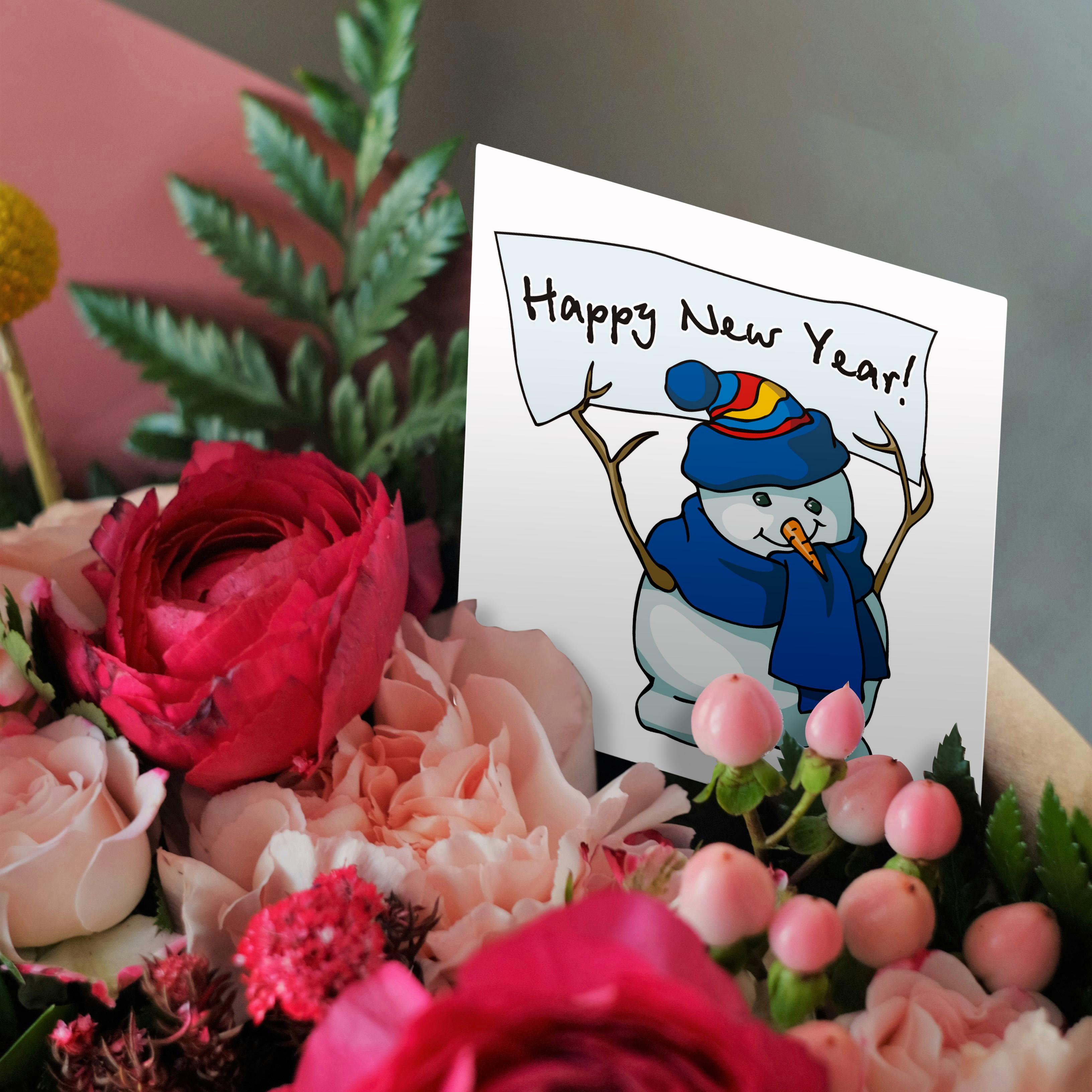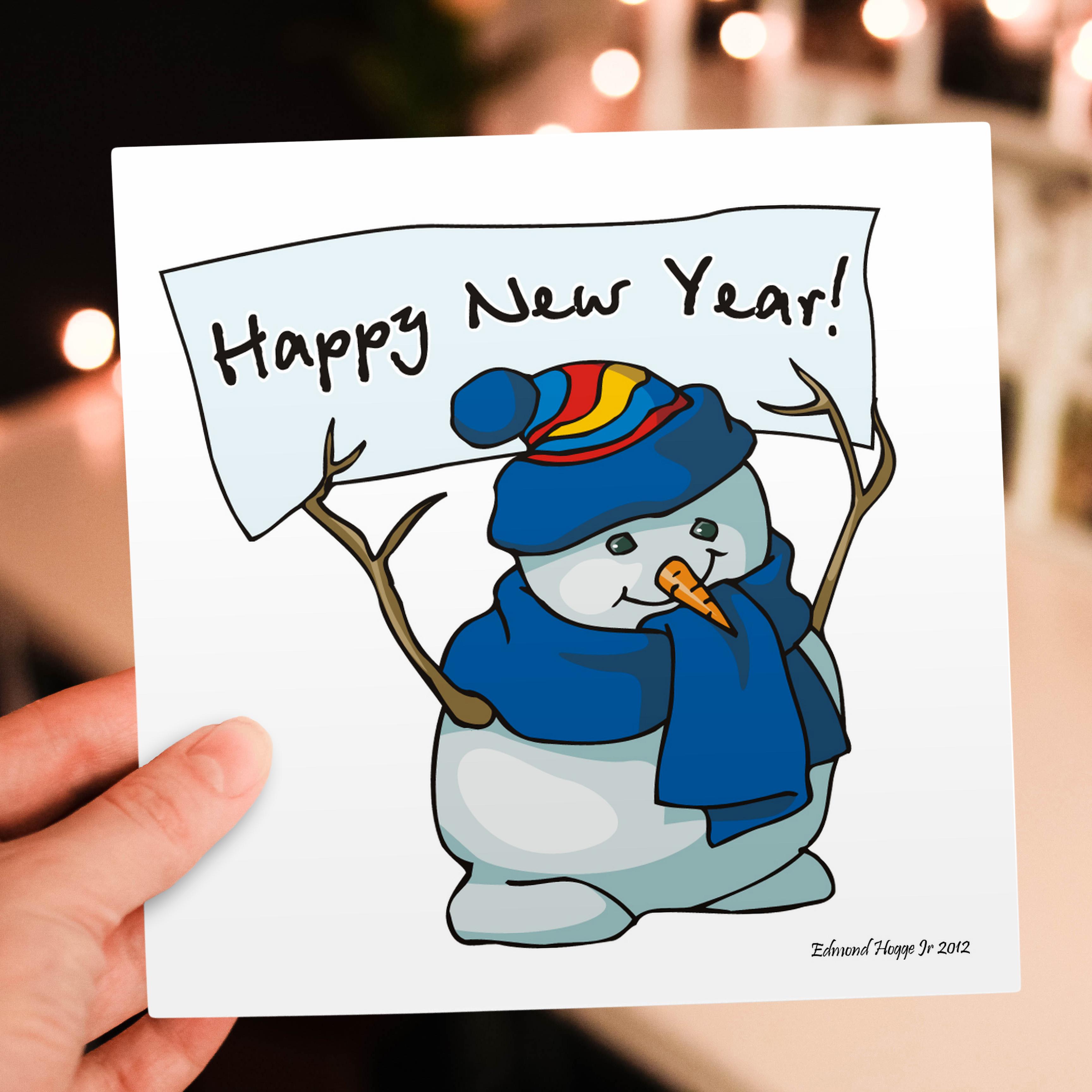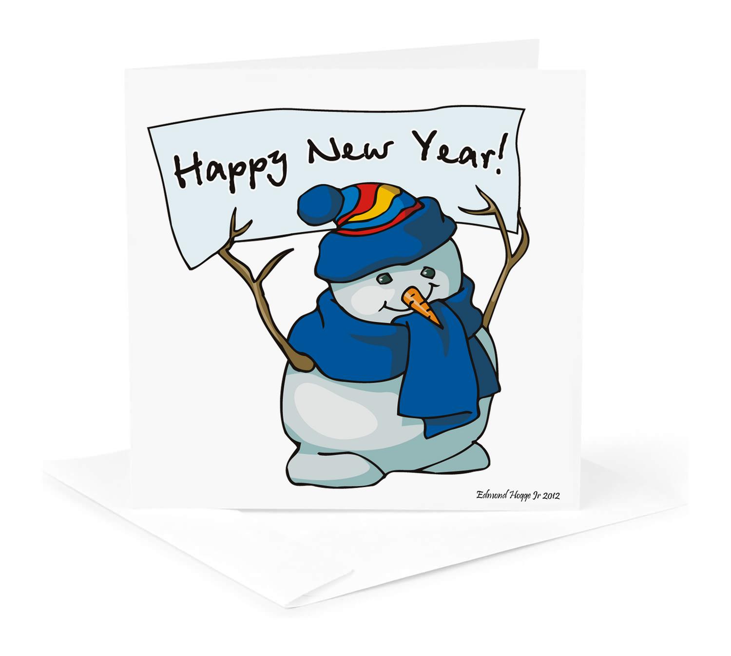 Happy New Year Snowman Greeting Card is a great way to say "thank you" or to acknowledge any occasion. These blank cards are made of heavy-duty card stock that allows for smudge free writing. Cards are creased for easy folding and come with white envelopes. Available individually or in sets of 6 and 12. Made in USA.