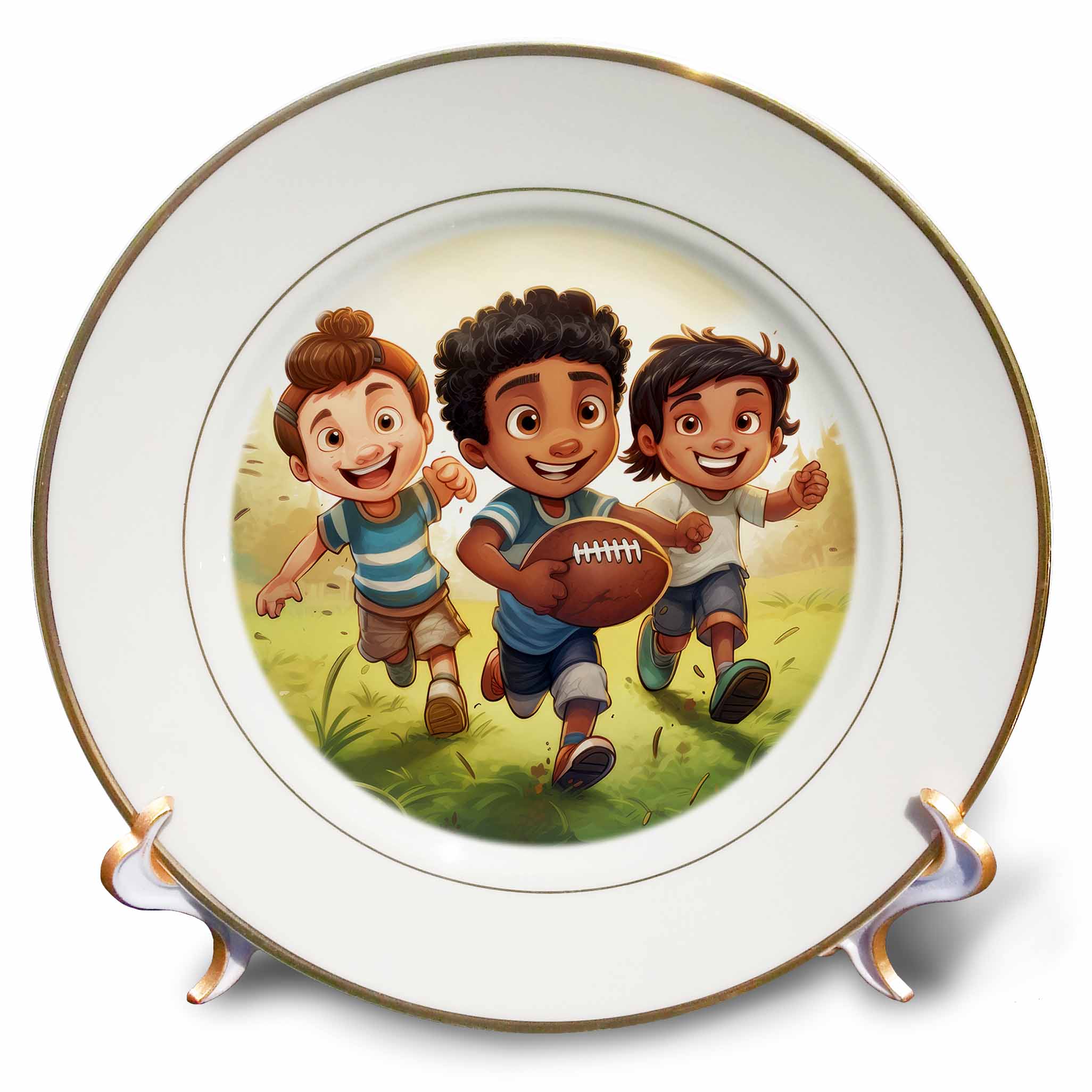 3dRose an Illustration of Three Young Children Running with a Football. - Plates (cp-384824)