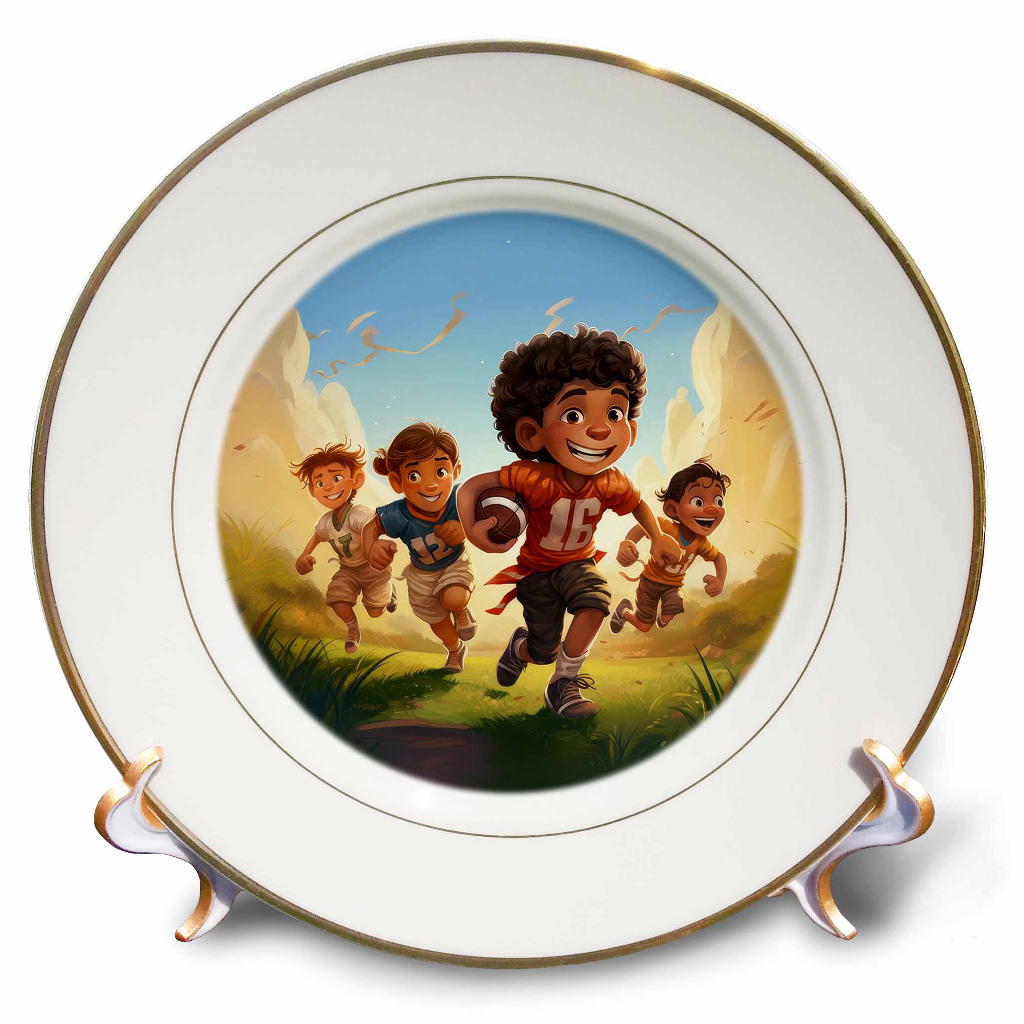 3dRose an Illustration of Young Children Running in a Field with a Football. - Plates (cp-384825)
