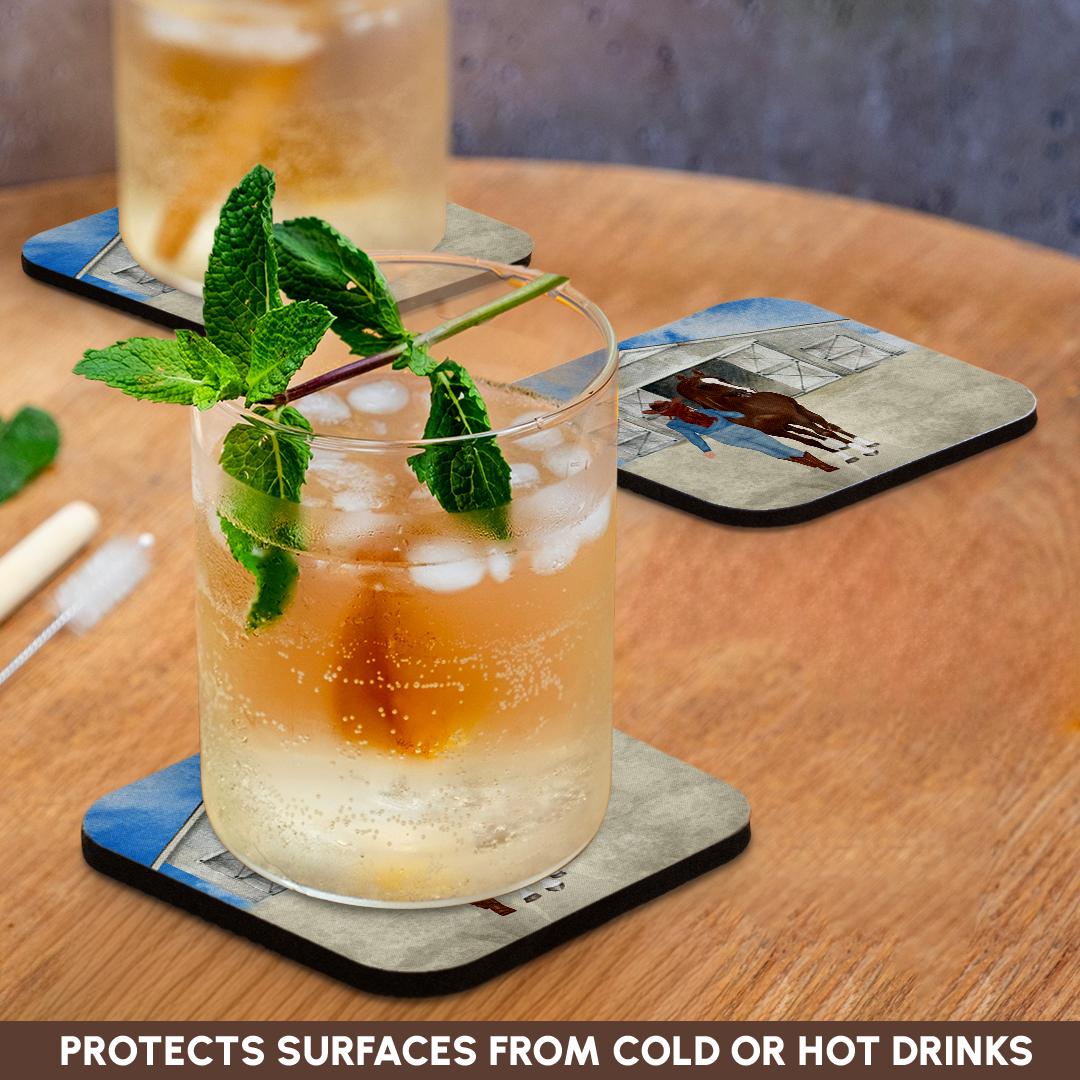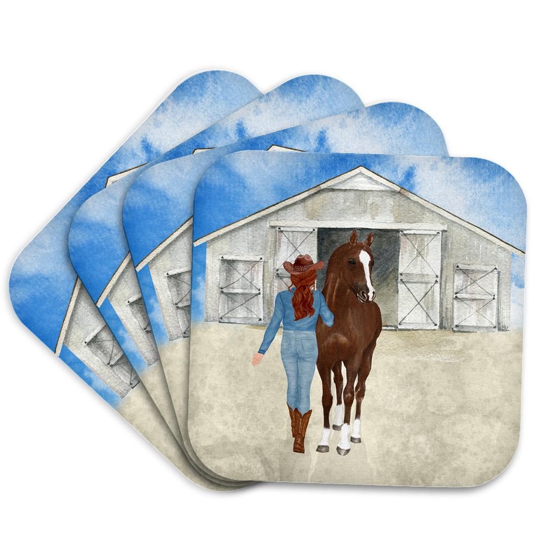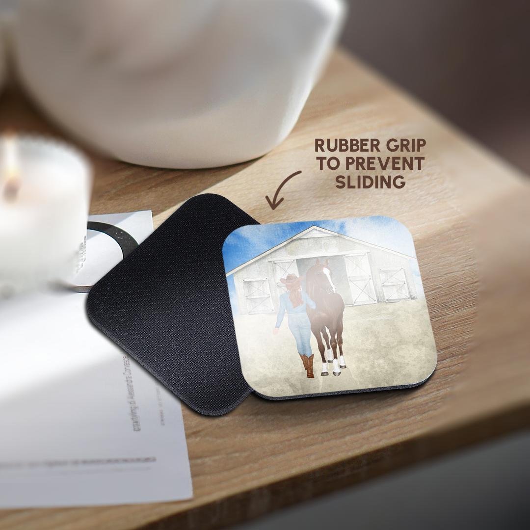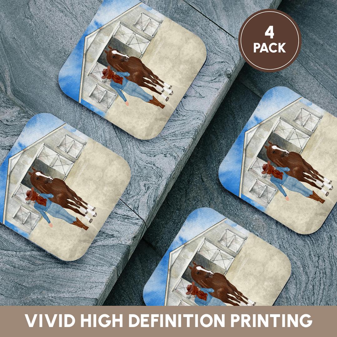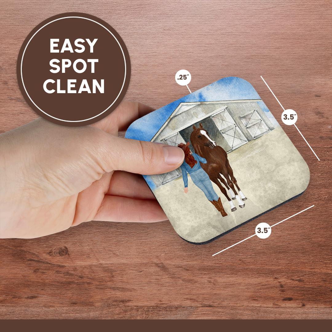 Country Western Cowgirl with her Horse and a Stable for Country Girls Coaster is a great complement to any home décor. Soft coasters are 3.5" x 3.5", are absorbent, and can be washed. Ceramic coasters are 4.25" x 4.25", non absorbent and come with felt corner pads. Available in sets of 4 and 8.
