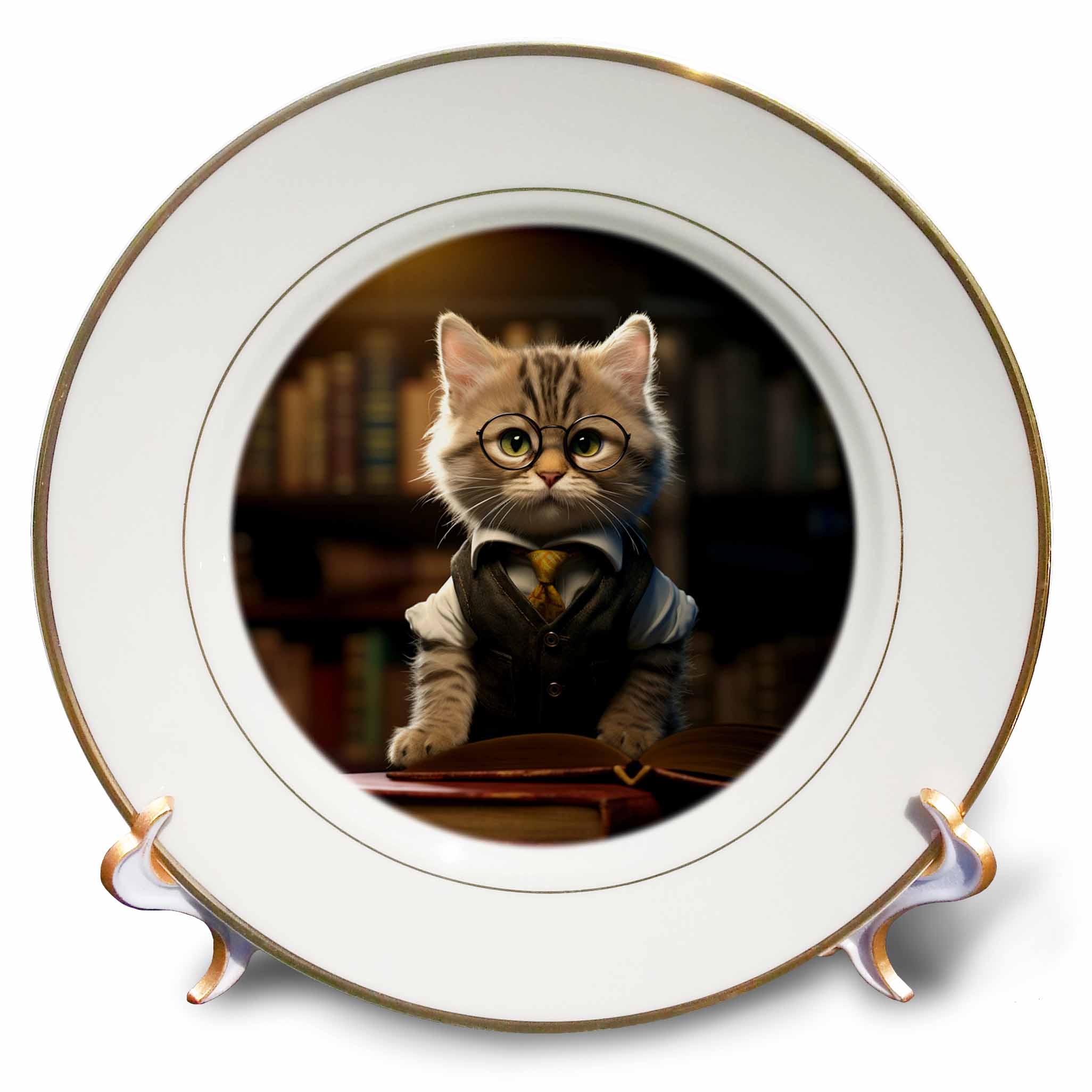 3dRose CR Media - Illustrations - Adorable kitten in a librarian outfit - Plates (cp-385469)