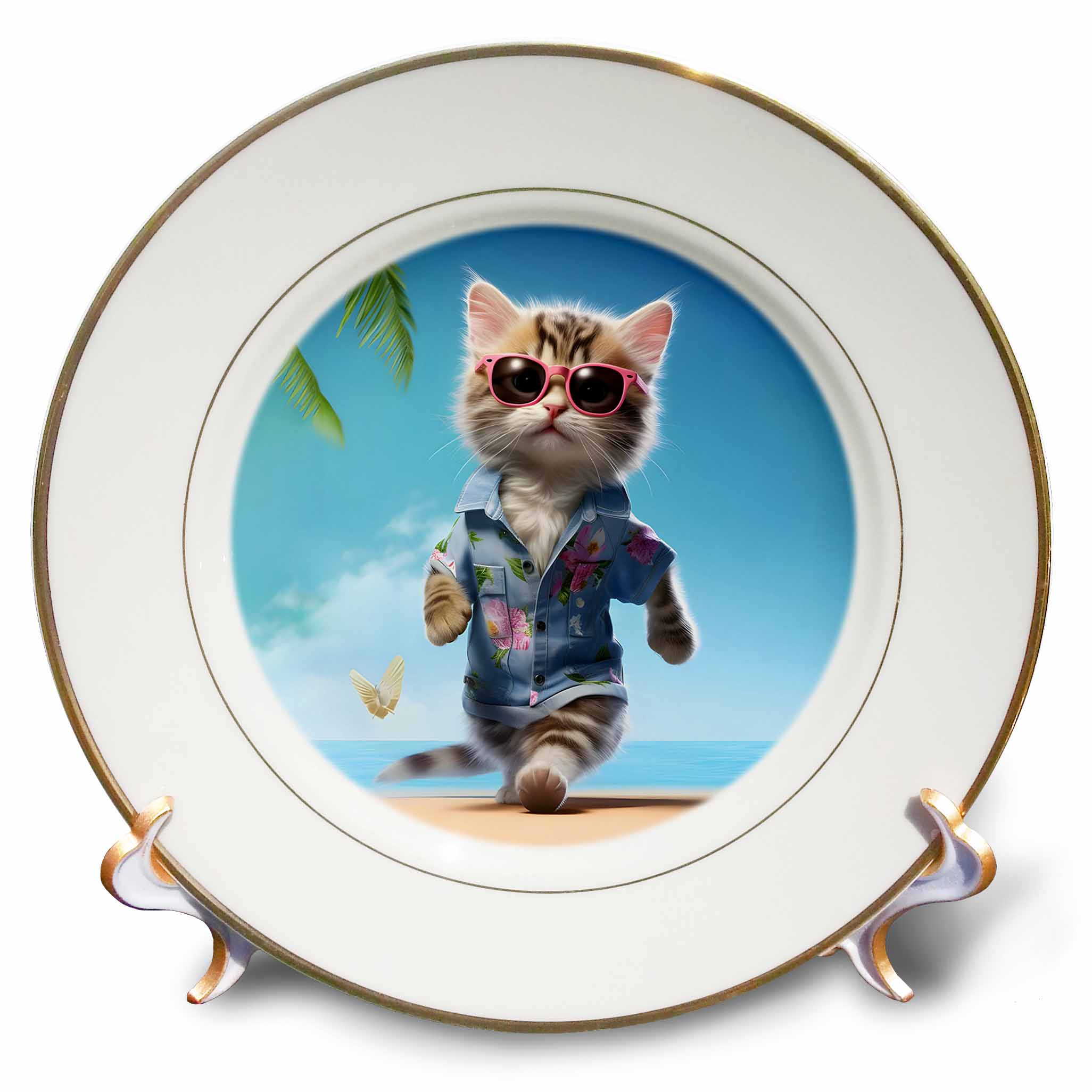 3dRose CR Media - Illustrations - Cool Kitten on a Beach in Holiday Attire - Plates (cp-385463)