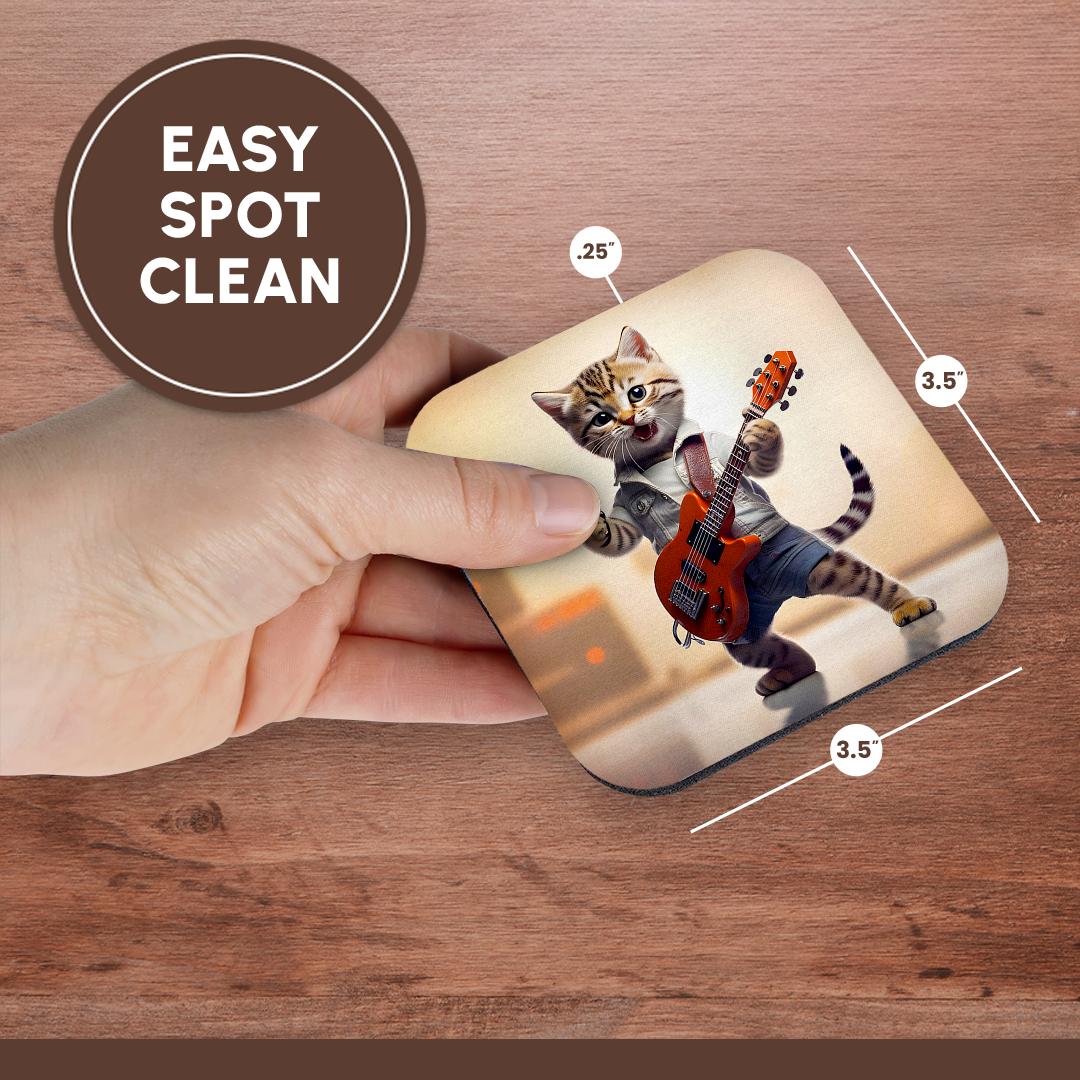 Rockstar Kitten playing an electric guitar Coaster is a great complement to any home décor. Soft coasters are 3.5" x 3.5", are absorbent, and can be washed. Ceramic coasters are 4.25" x 4.25", non absorbent and come with felt corner pads. Available in sets of 4 and 8.
