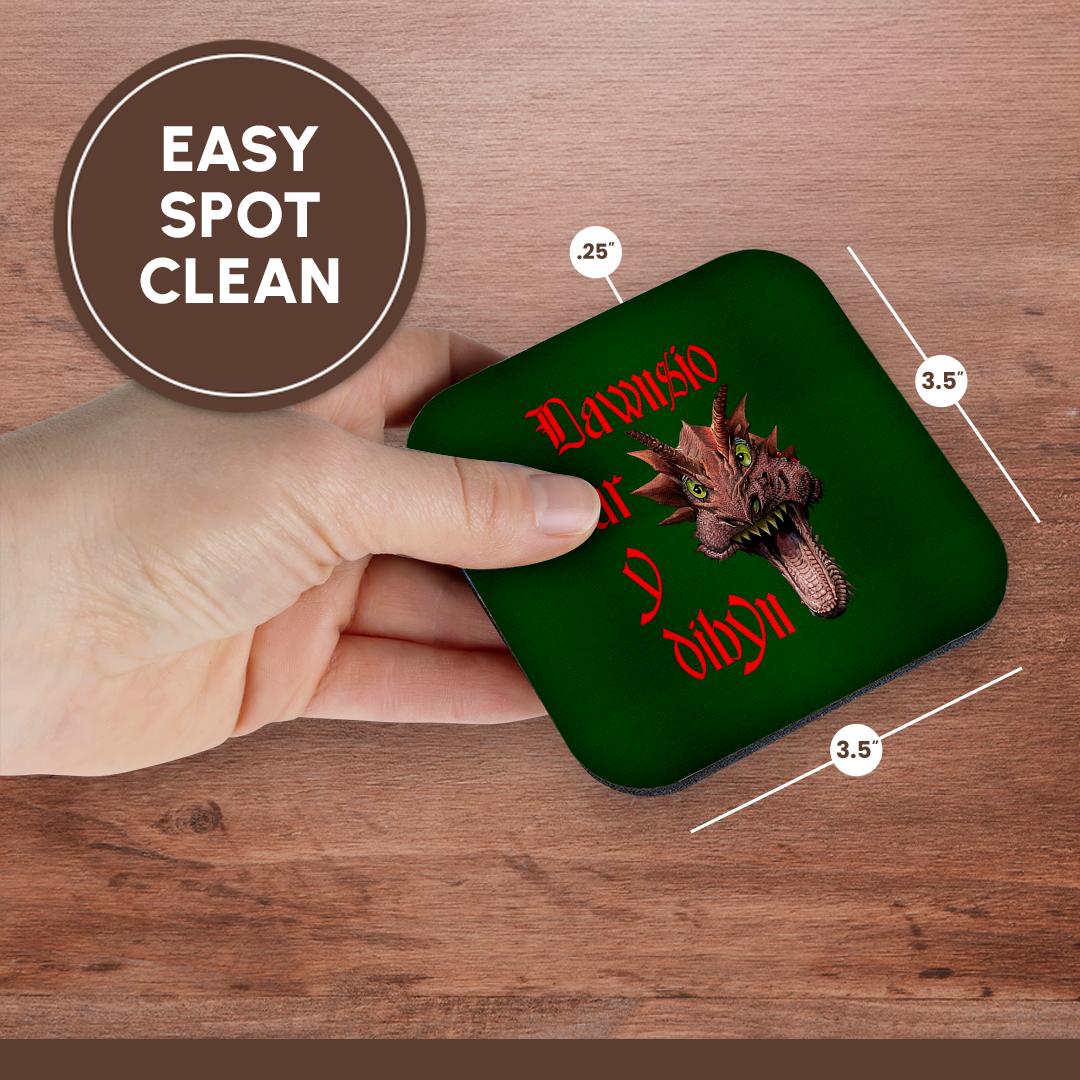 Dawnsio ar y dibyn Welsh Rugby Union Dragon Coaster is a great complement to any home décor. Soft coasters are 3.5" x 3.5", are absorbent, and can be washed. Ceramic coasters are 4.25" x 4.25", non absorbent and come with felt corner pads. Available in sets of 4 and 8.