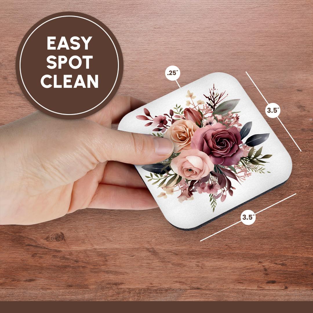 Dusty Rose Boho Flower Illustration Coaster is a great complement to any home décor. Soft coasters are 3.5" x 3.5", are absorbent, and can be washed. Ceramic coasters are 4.25" x 4.25", non absorbent and come with felt corner pads. Available in sets of 4 and 8.