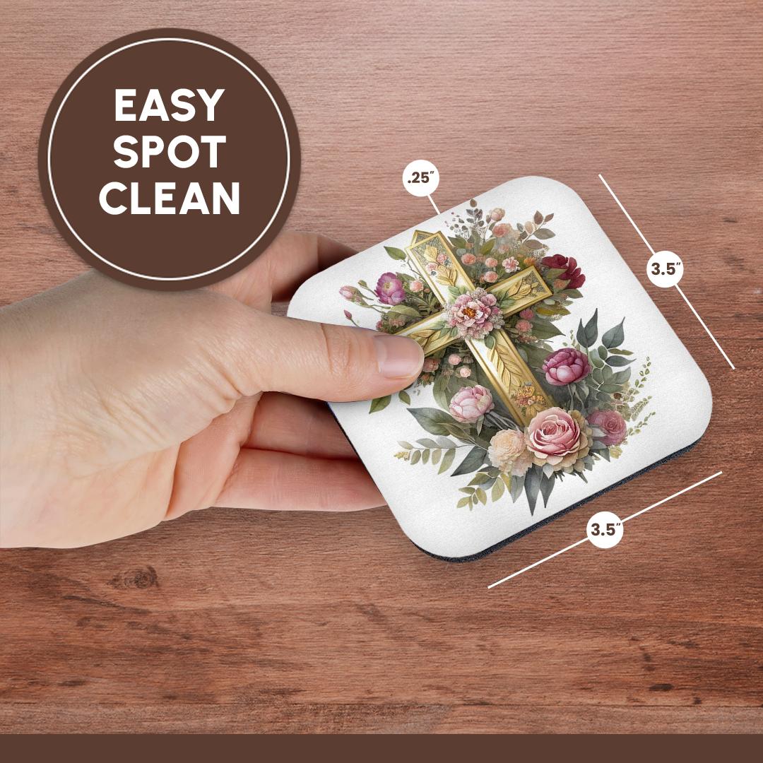 3dRose Elegant Pink Floral Image of Gold Cross Illustration - Coasters (cst-383276)
