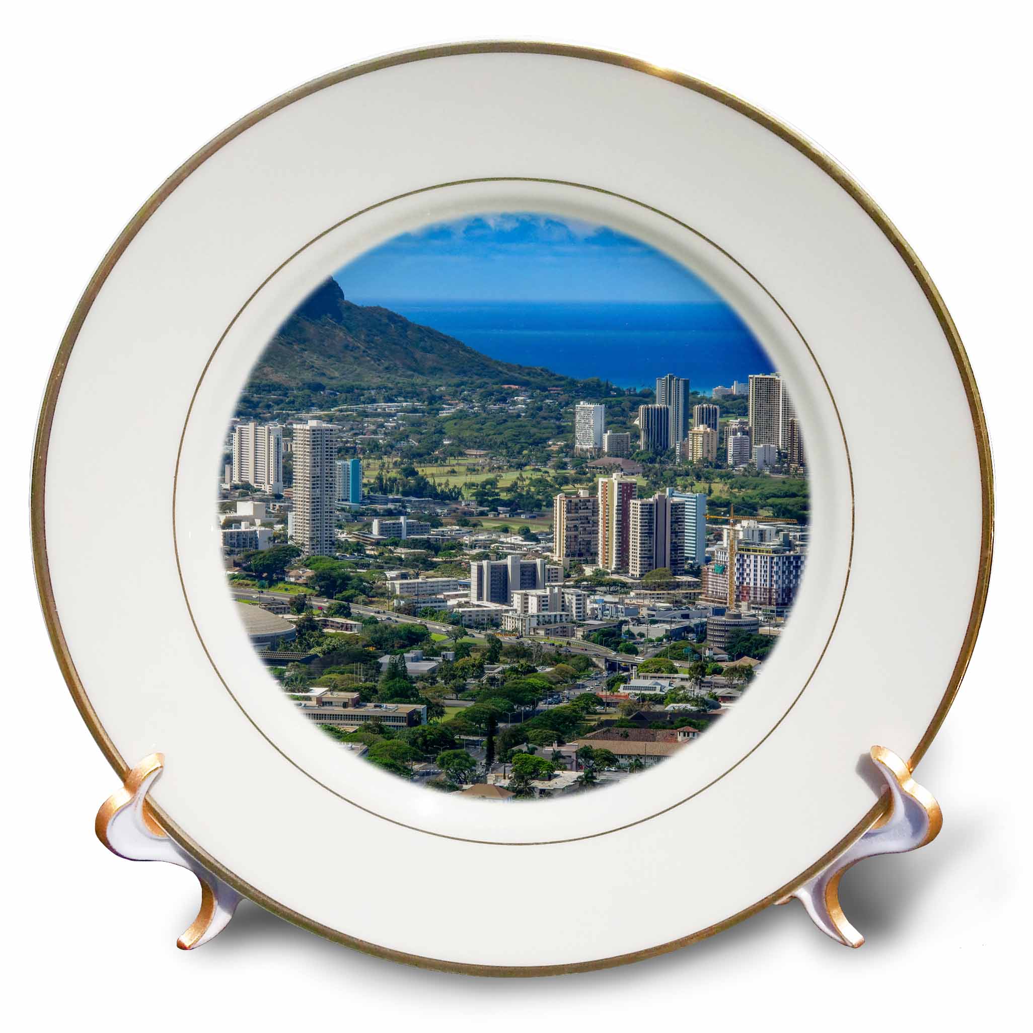 Elevated view of downtown Honolulu and Diamond Head, Oahu, Hawaii. Plate is 7.5" in diameter. Made of white porcelain featuring two 24k gold rims. Excellent to give as a gift commemorating a special person or event. Stand included. Decorative use only.