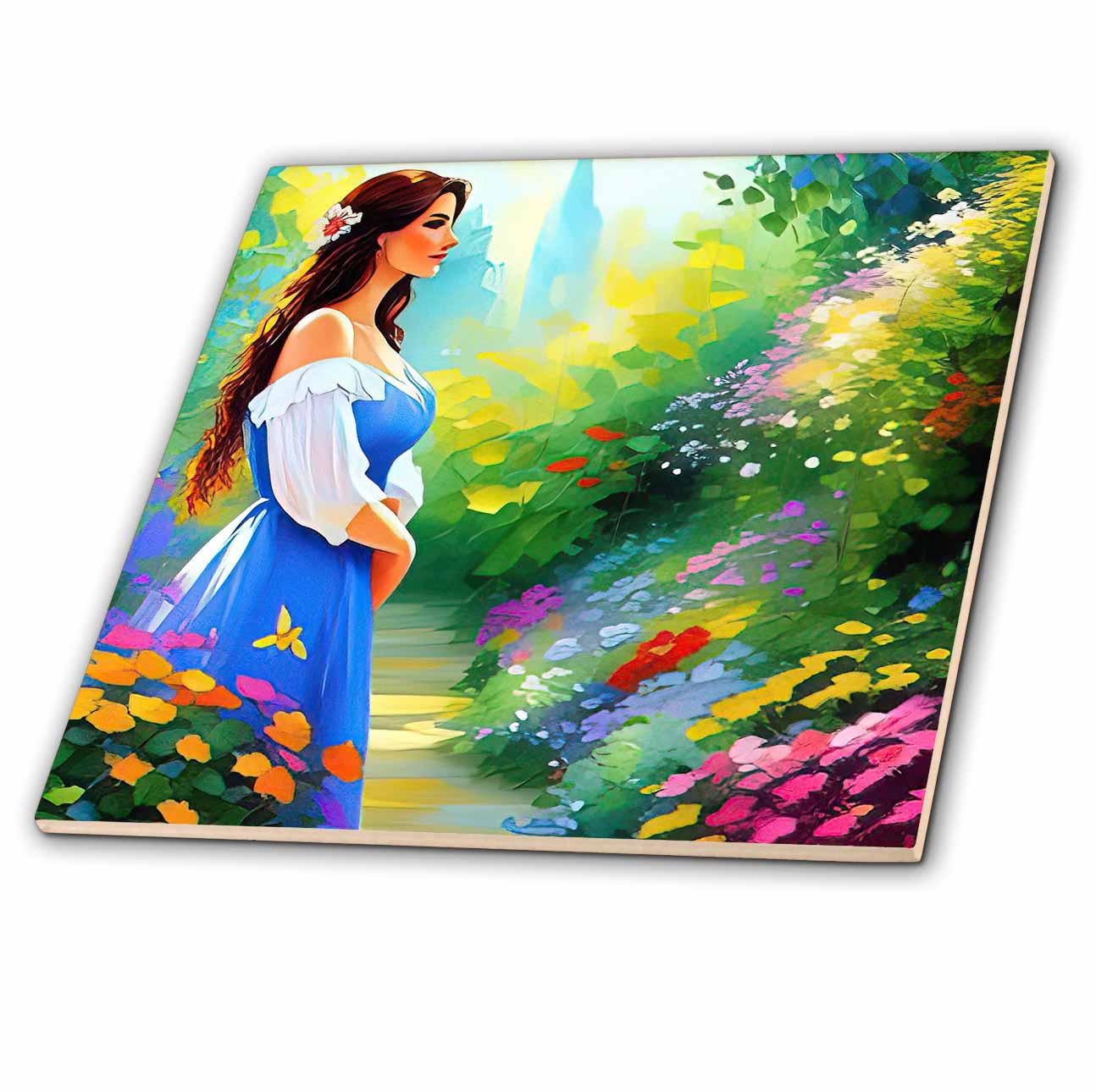 3dRose Enchanting Young Lady in Blue Dress in The Flower Garden Love Gift - Tiles (ct-379145)