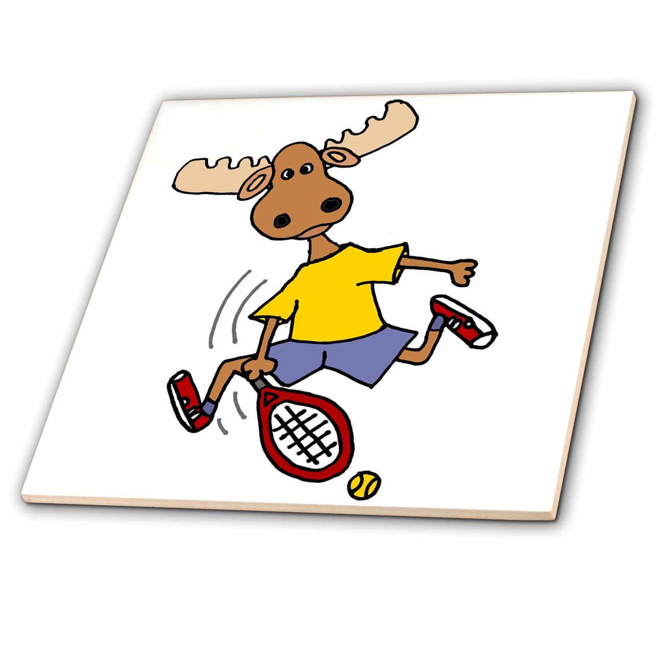 Funny Cute Moose Playing Tennis Sports Cartoon Tile is great for a backsplash, countertop or as an accent. This commercial quality construction grade tile has a high gloss finish. The image is applied to the top surface and can be cleaned with a mild detergent.