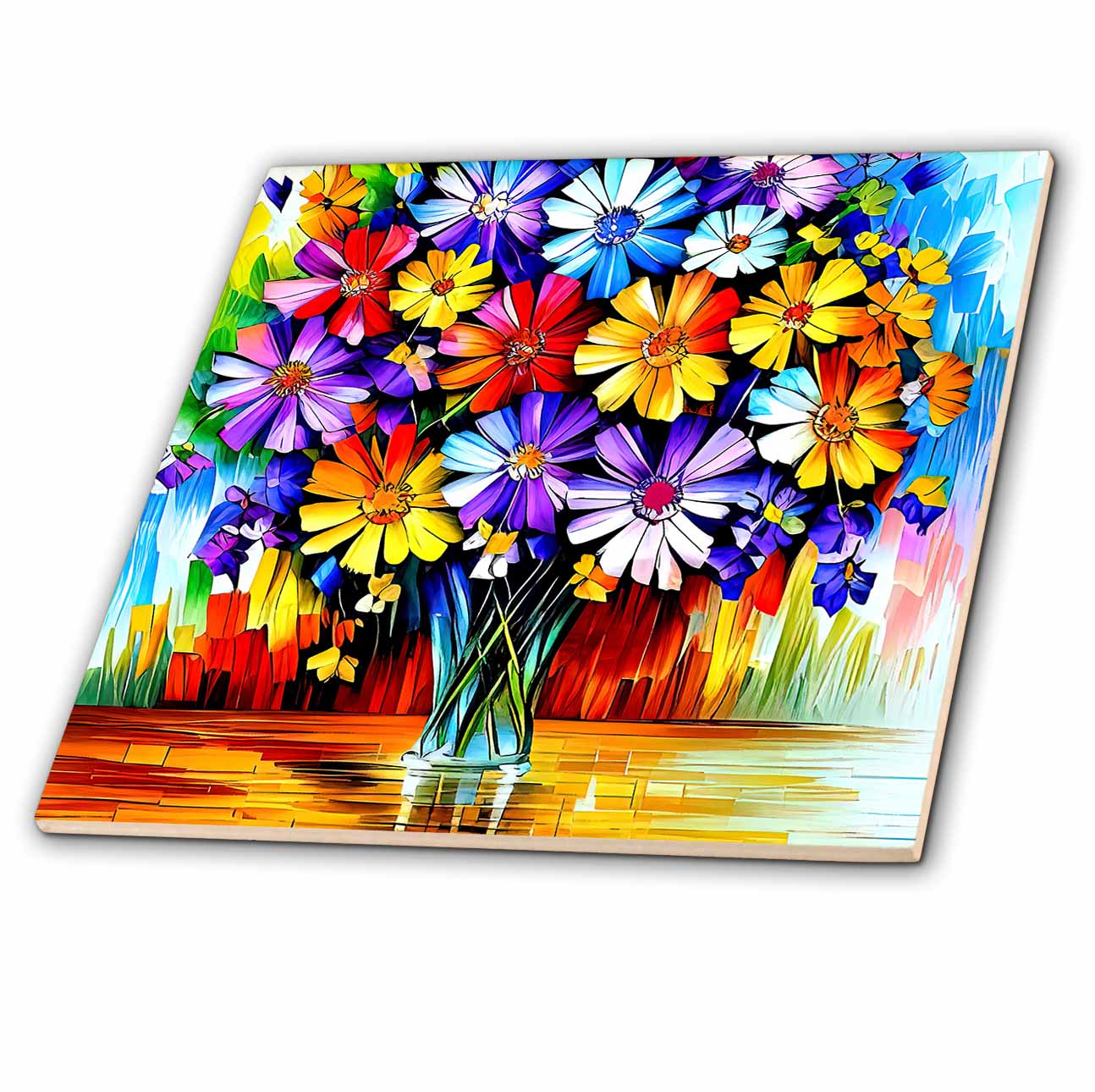 3dRose Large Bouquet of Flowers in a Glass vase on an Old Wooden Table Gift - Tiles (ct-374965)